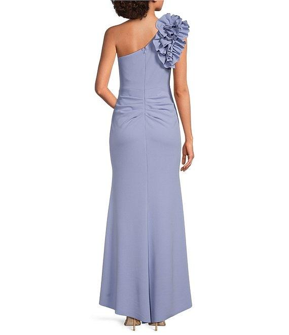 From Xscape Petite, this gown features: Scuba crepe fabrication Sheath silhouette One-shoulder neckline Sleeveless Ruffled detailing Lined Center back zipper closure Approx. 58" length Polyester/spandex Dry clean Made in the USA.