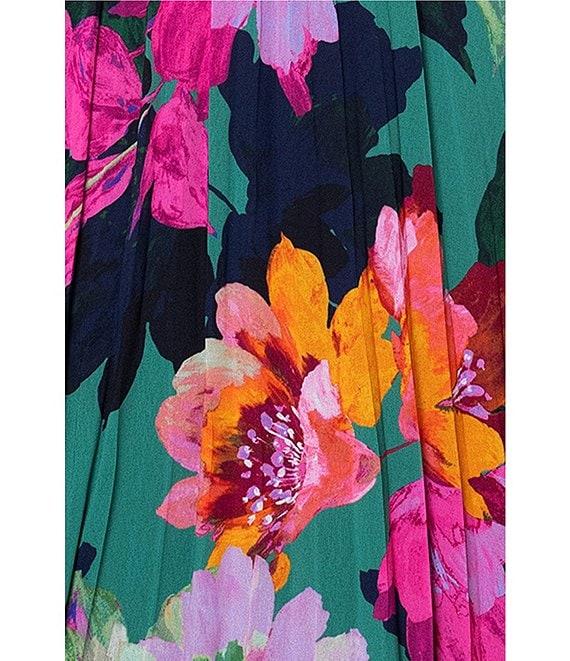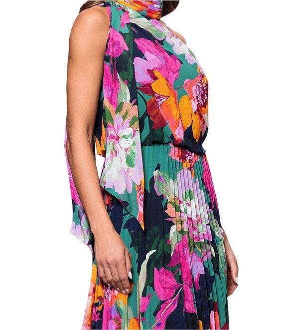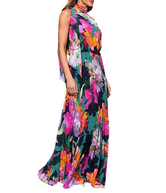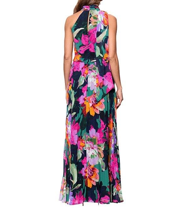 Xscape Pleated Chiffon Floral Print Halter Neck Scarf Sleeveless Blouson Maxi Dress