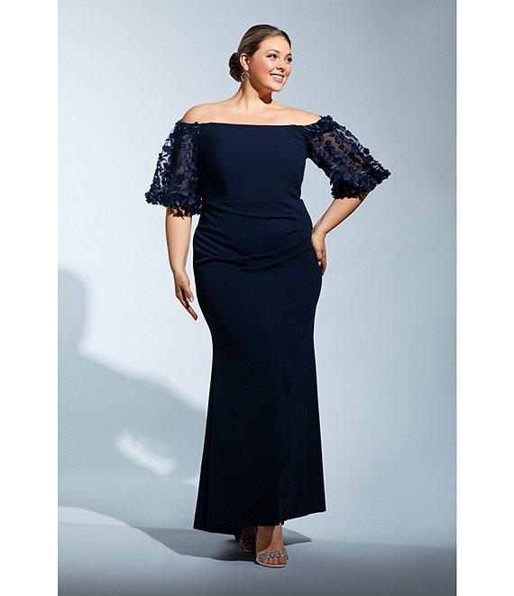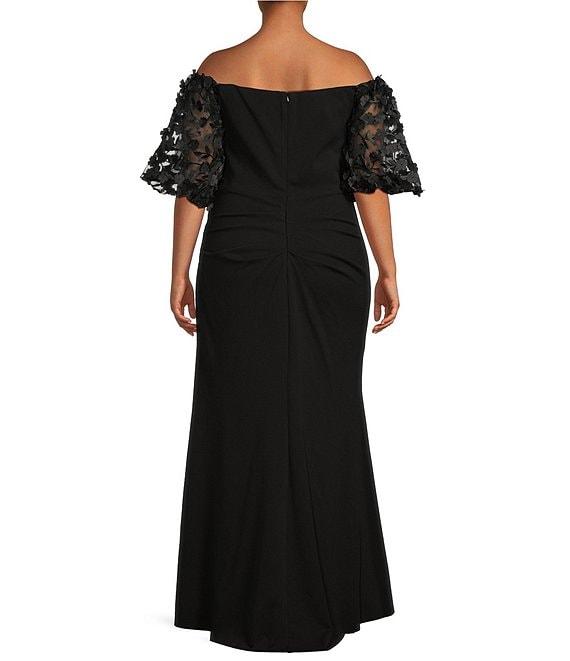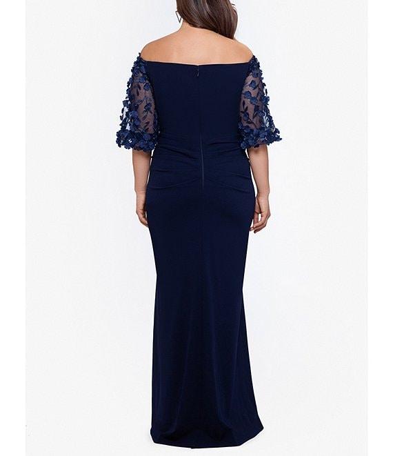 From Xscape Plus, this gown features: Scuba crepe fabrication Sheath silhouette Off-the-shoulder neckline Short puffed sleeves 3D floral applique on mesh sleeves Side and back ruching detail Tulip skirt Fully lined Invisible back zipper closure approx. 63" in length Polyester/spandex Spot clean Imported.