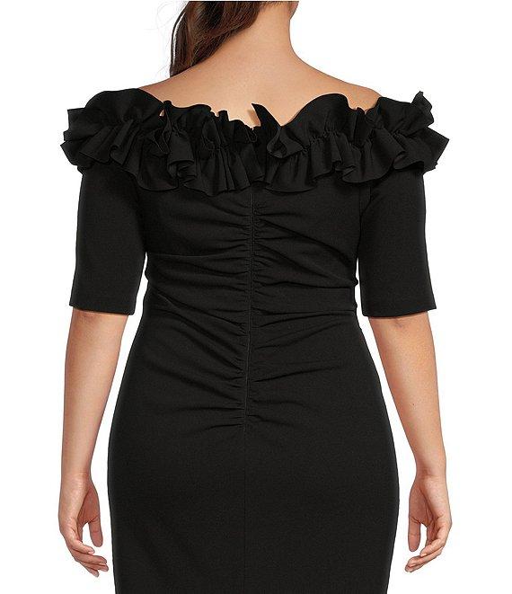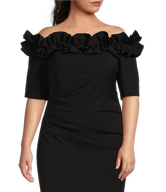 From Xscape Plus, this gown features: Crepe fabrication Sheath silhouette Off-the-shoulder neckline Short sleeves Ruffle applique detail at neckline Side and back ruching Back slit Partially lined Invisible back zip closure Approx. 63" length Polyester/spandex Dry clean Imported.