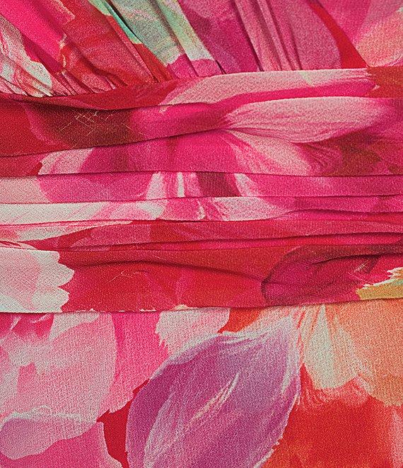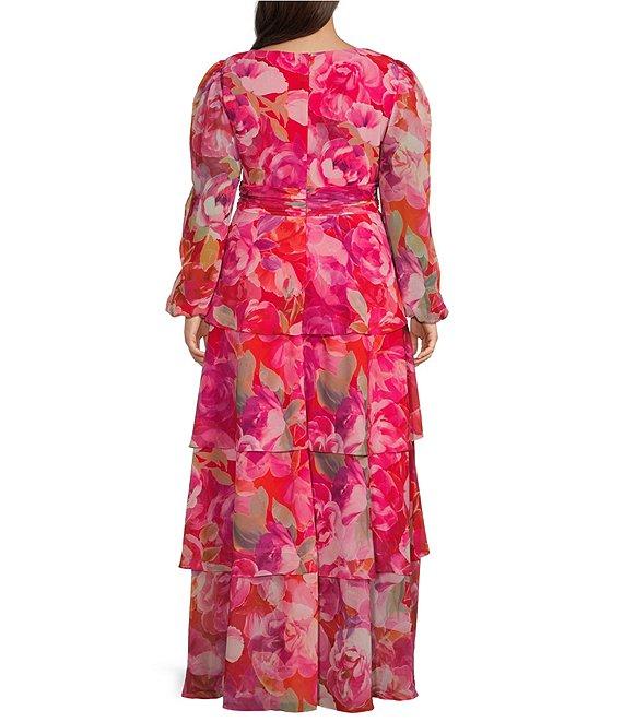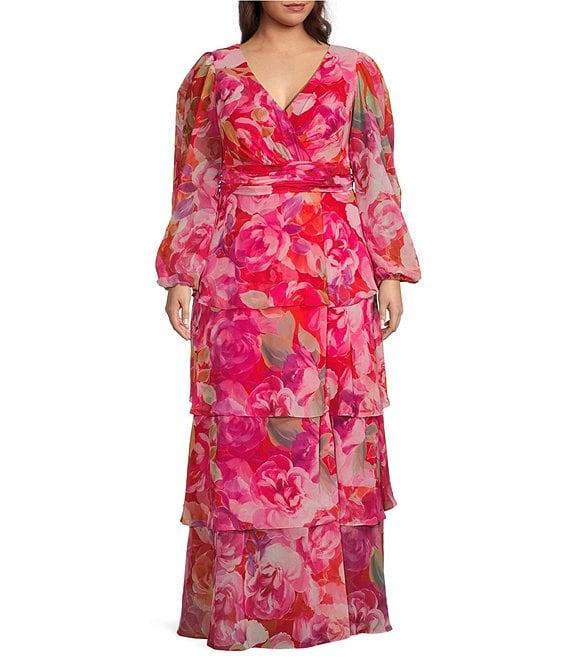 From Xscape Plus, this dress features: Chiffon fabrication V-neckline Long sleeves Lined Floral print Ruched waist Tiered skirt Zip back closure Approx. 62.5" in length Polyester Dry clean Imported.