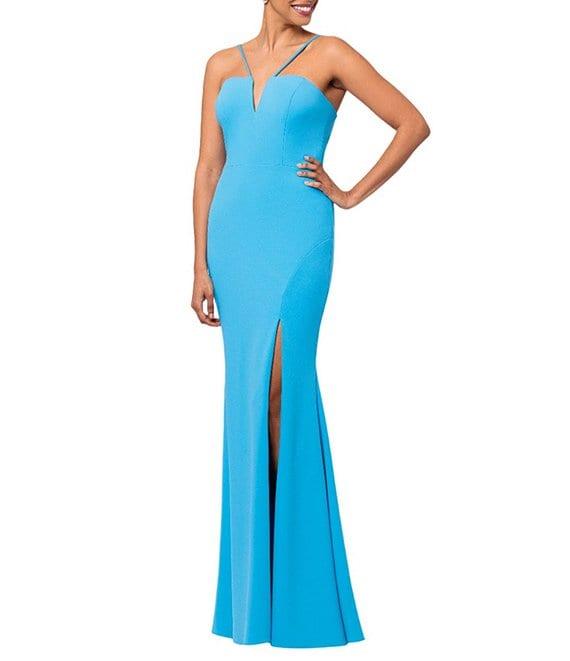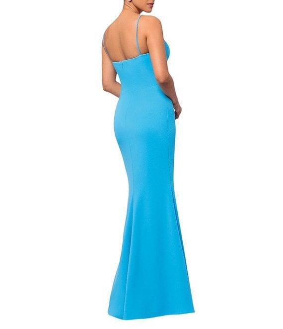 From Xscape, this dress features: Scuba crepe fabrication Sheath silhouette Split V neckline Sleeveless Front slit detail Lined Back zipper closure Approx. 62" length Polyester/spandex Dry clean Made in the U.S.A.