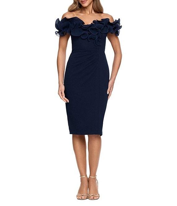 From Xscape, this dress features: Suba crepe fabrication off-the-shoulder necklineSleevelessWire ruffle trim Ruched back detail Zip back closure Approx. 42.5" length Polyester Dry clean Imported.