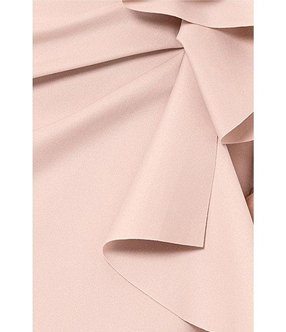 From Xscape, this dress features: Scuba fabrication Sheath silhouette Off-the-shoulder neckline Short sleeve Ruffle detail Lined Back zipper closure Approx. 44" length Polyester/spandex Dry clean Made in the U.S.A.