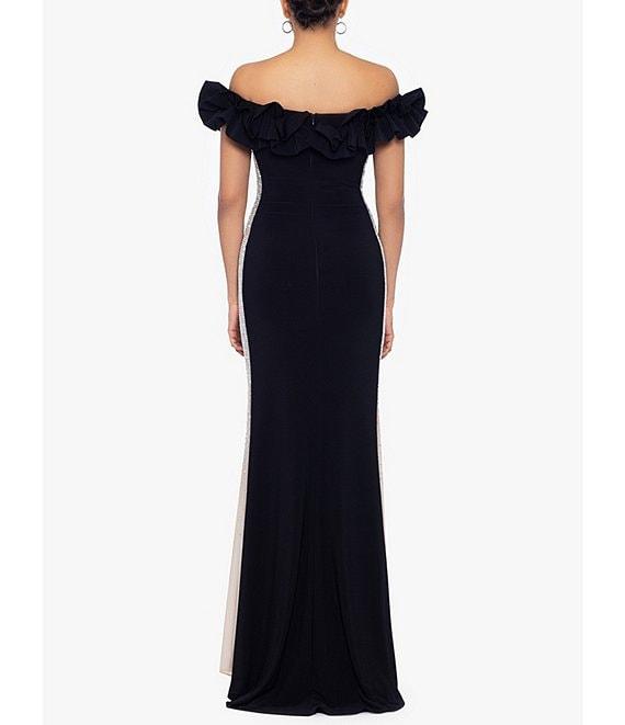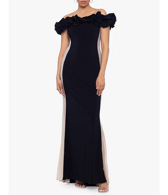 From Xscape, this gown features: all over stretch fabrication ruffled off-the-shoulder neckline cap sleeves rhinestone mesh side embellishment fully lined center zip back closure Approx. 62" length from shoulder to hem polyester/spandex spot clean Imported.