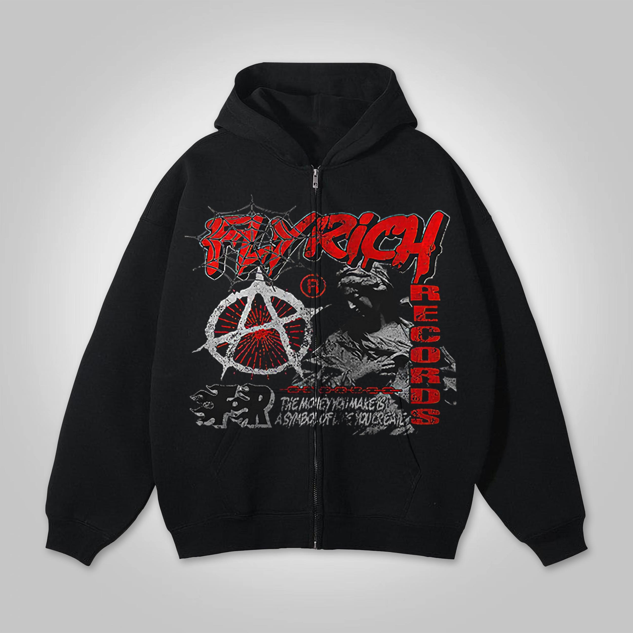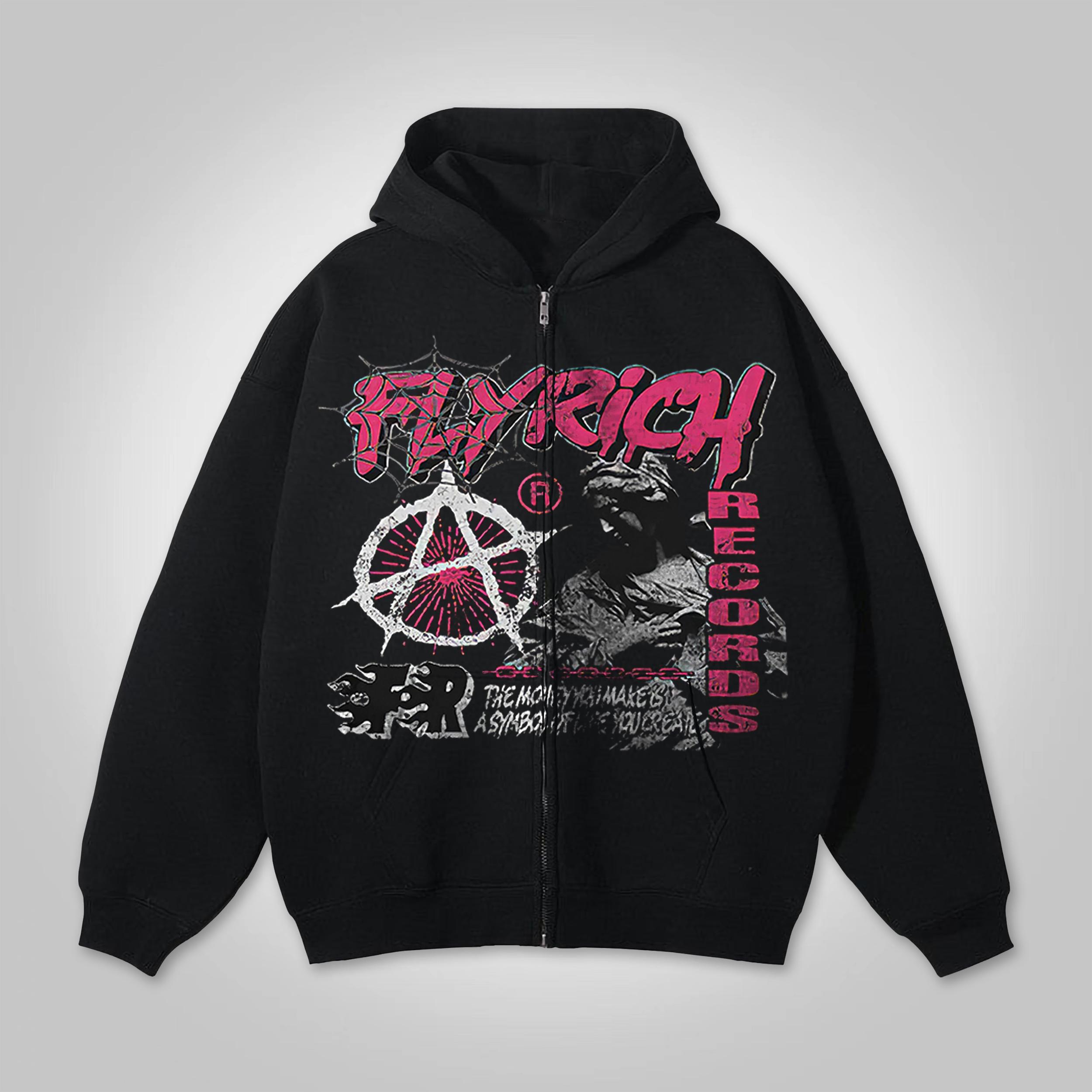 Y2k Fashion Fly Rich Vintage 2019 Graphic Hip Hop Oversized Zip Up Hoodie