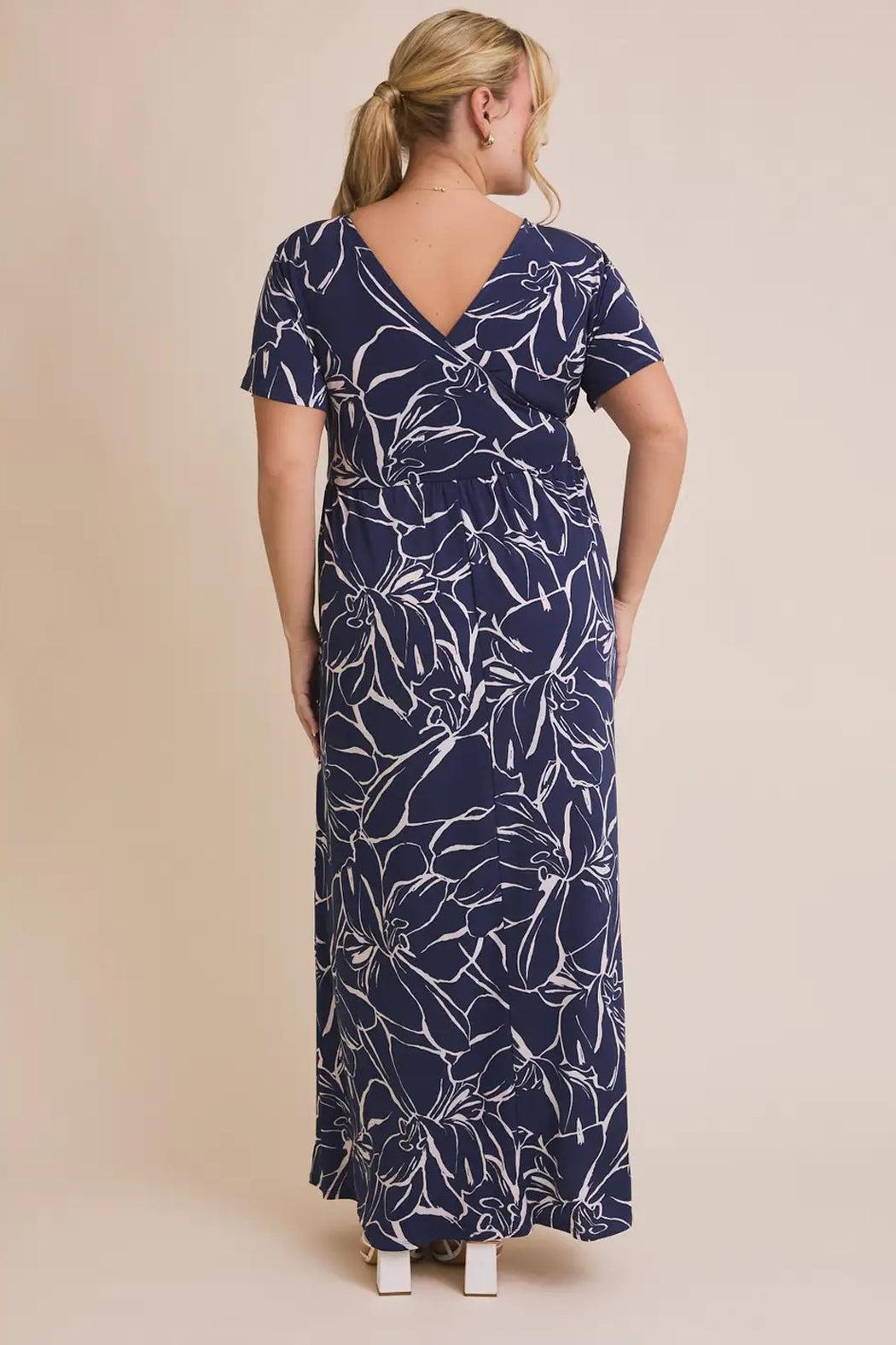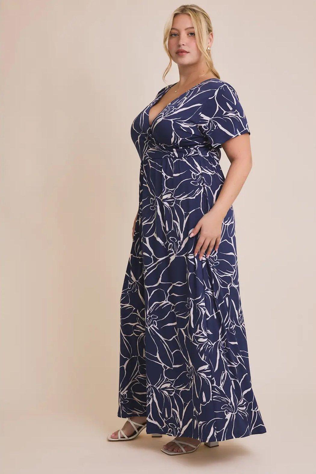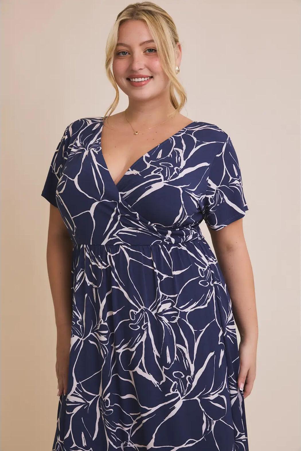 In an abstract navy and white floral print, this short sleeve v-neck maxi dress is fitted at the waist with a flowing skirt. made from a soft and stretchy material, this dress is comfortable and flattering. Perfect for a wedding summer date night.