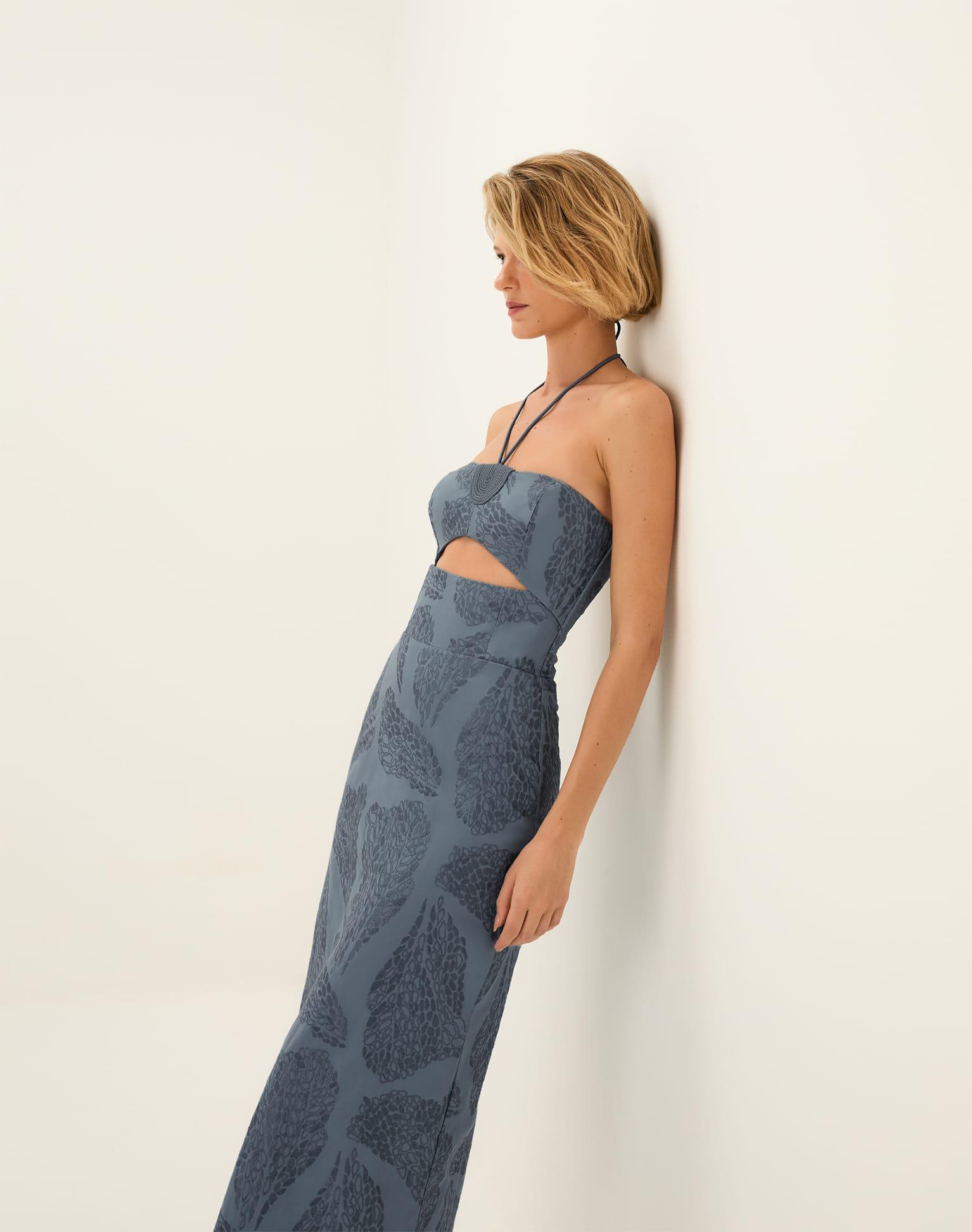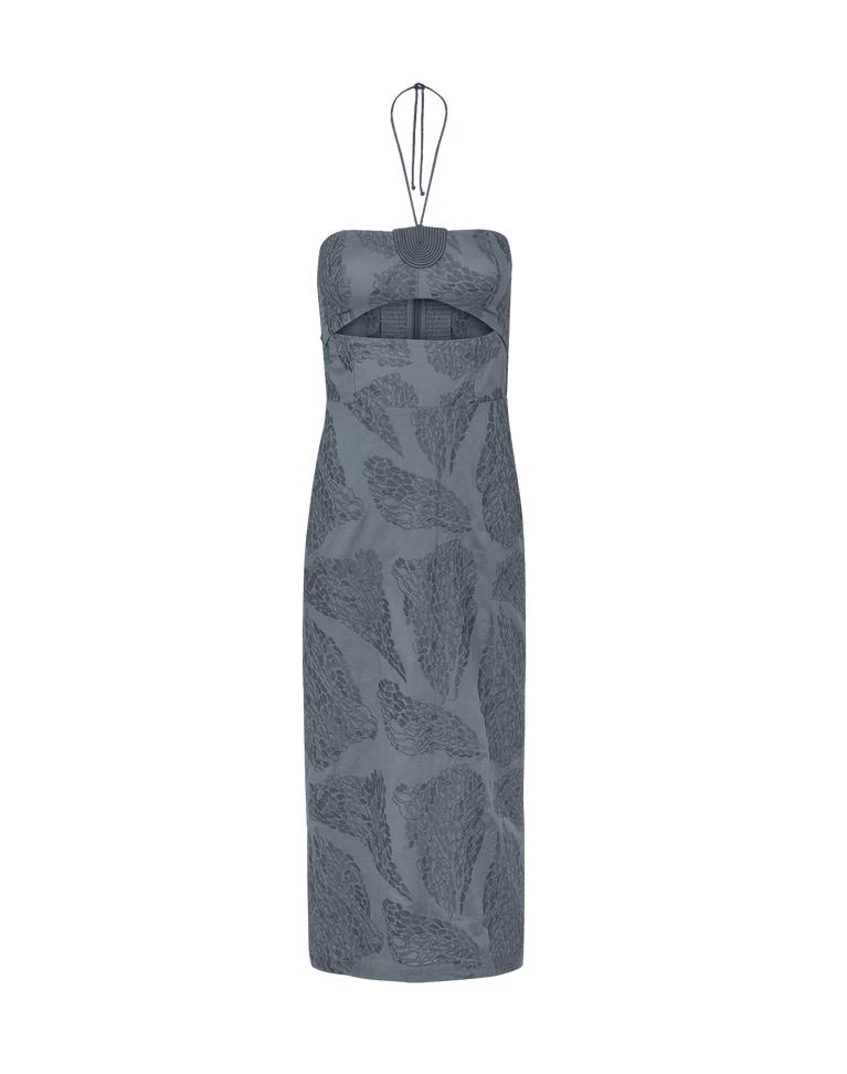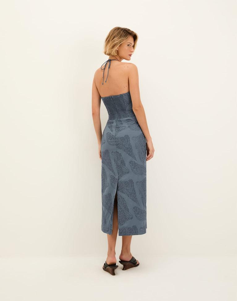 The ViX Yara Midi Dress is a sleeveless silhouette crafted with embroidered cotton and featuring an open neckline adorned with a standout semicircular rope detail at the front. Rope ties fasten elegantly at the neck, while a subtle cutout sits just below the bust. Finished with a smocked back, bottom slit, and a concea