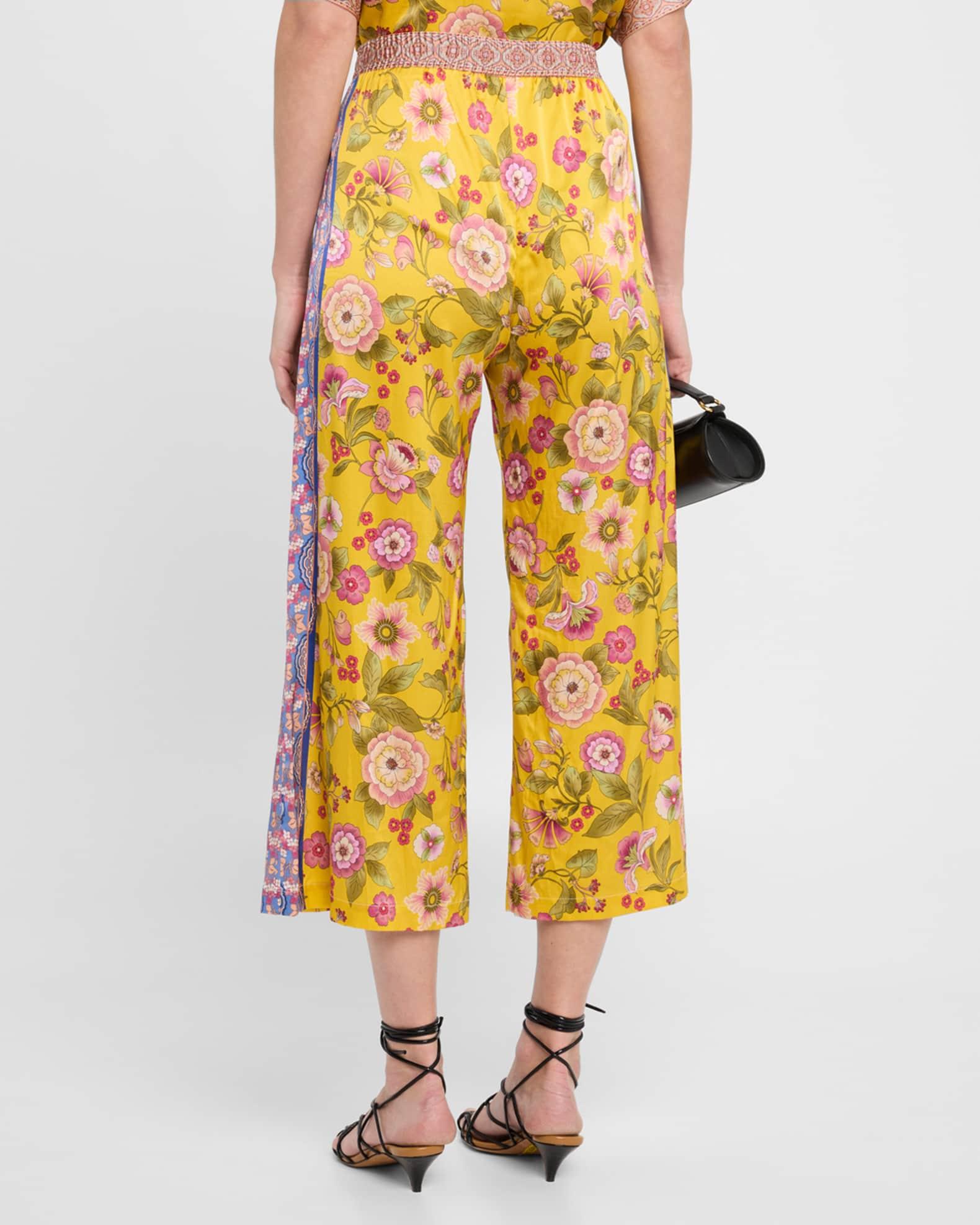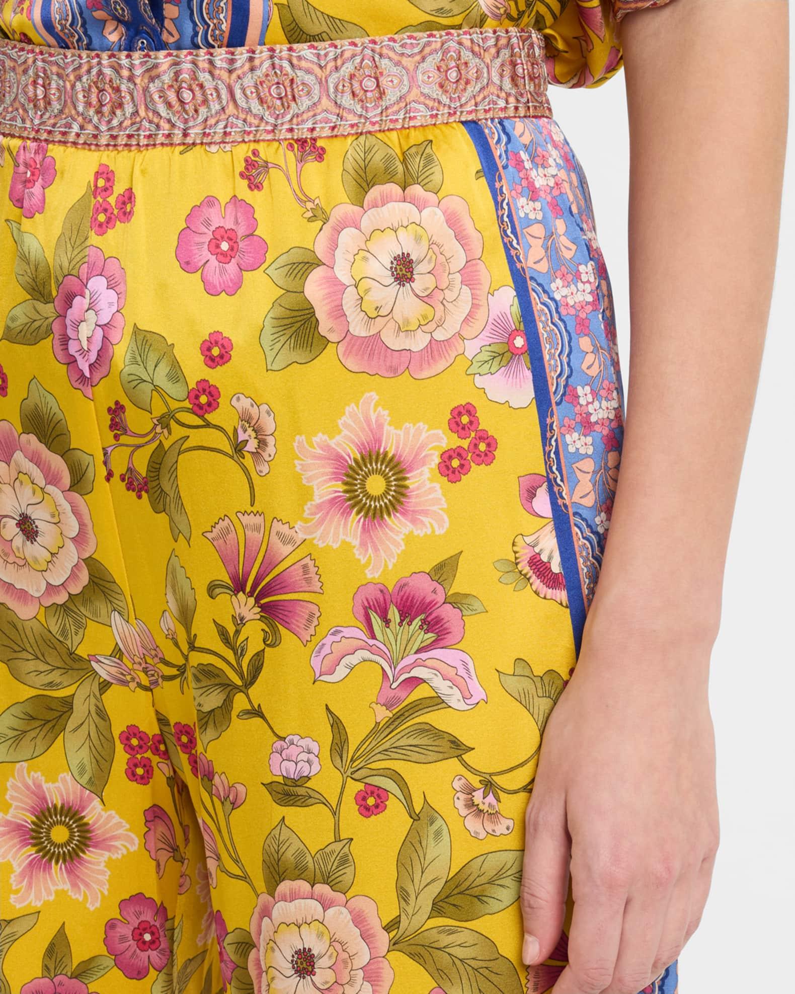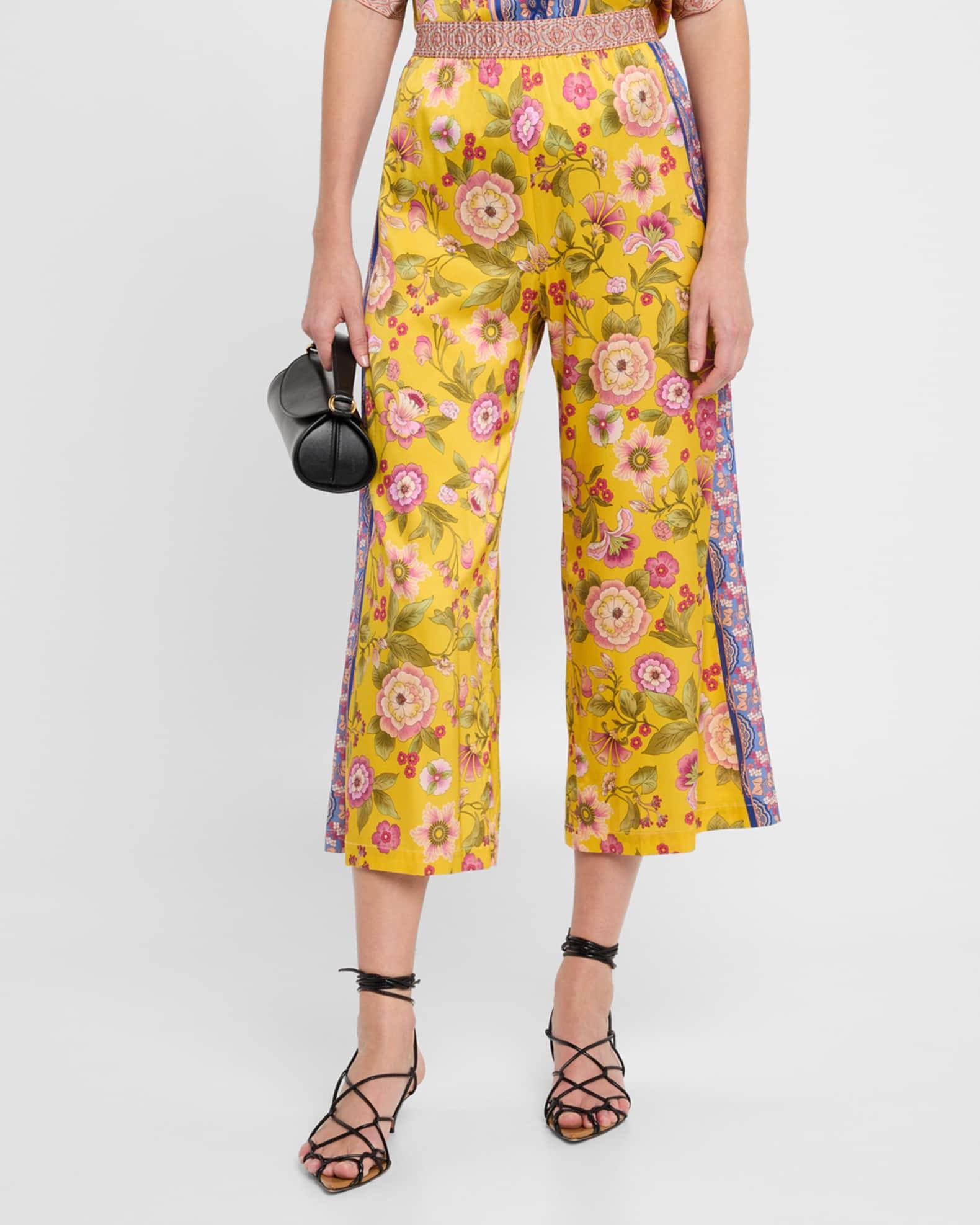 Johnny Was "Yasmin" pants in Camara floral print with contrast floral-print sides and waistband Mid-rise sits high on the hips Elasticized waistband Flat front Cropped at the ankle Wide legs Pull-on style Silk/spandex Hand wash Trim: Printed Imported Please note: This merchandise may have a distressed effect. It is a unique feature that enhances the product and is not considered a defect.
