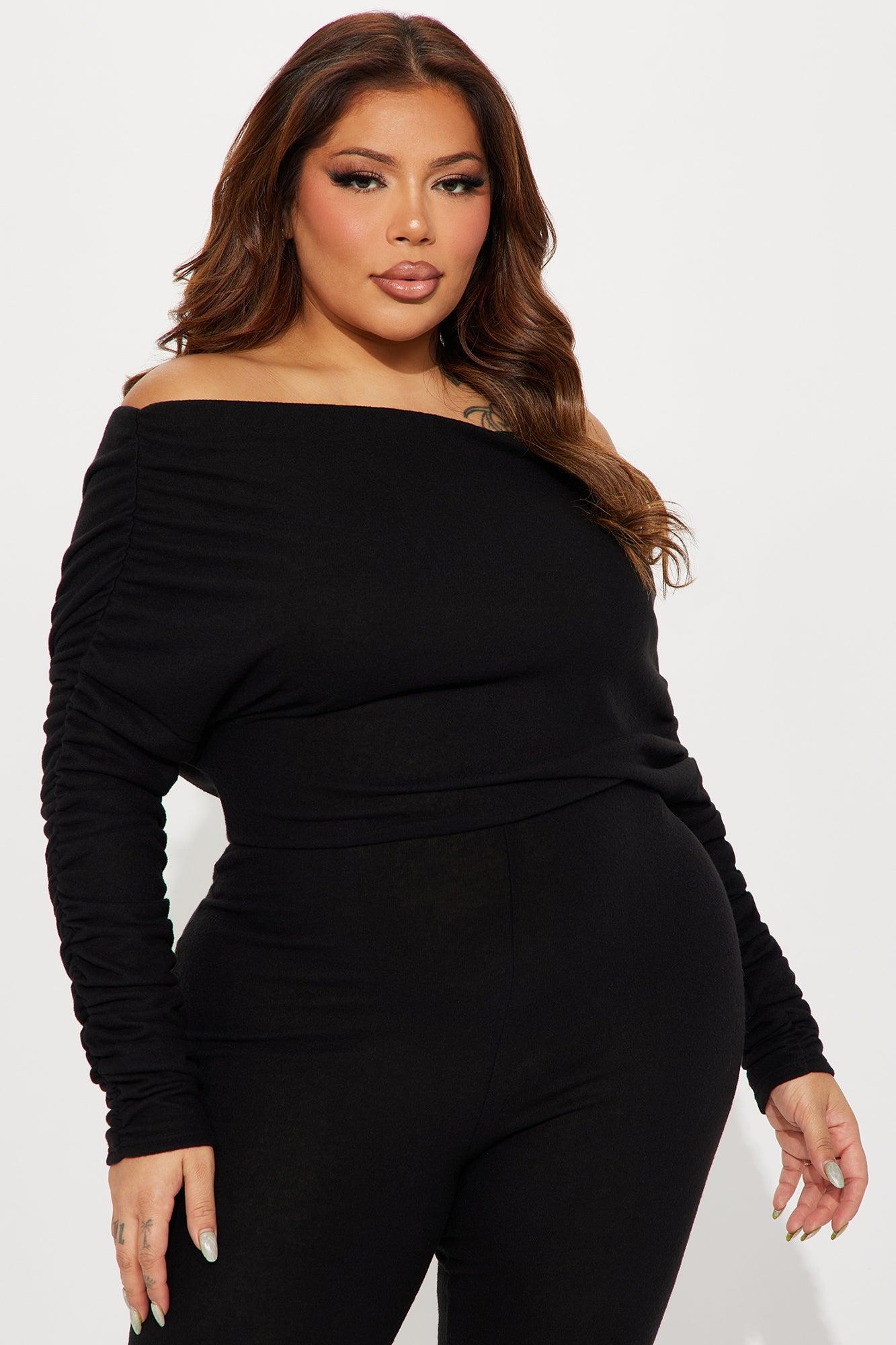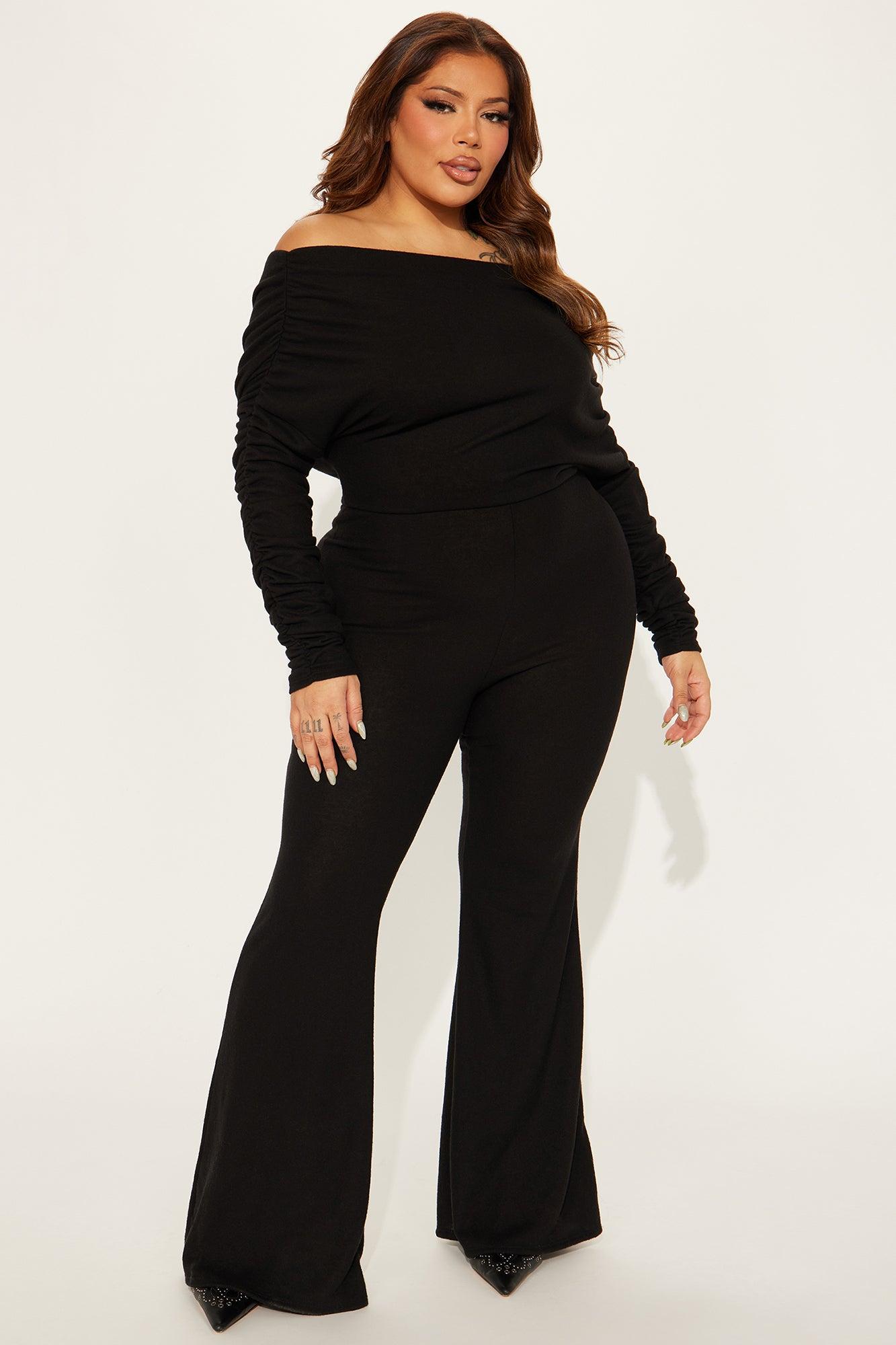 Available In Black And Cream. Jumpsuit Off The Shoulder Long Sleeve Ruched Detail Flare Leg Stretch Inseam = 34" 72% Rayon 21% Polyester 7% Spandex Imported