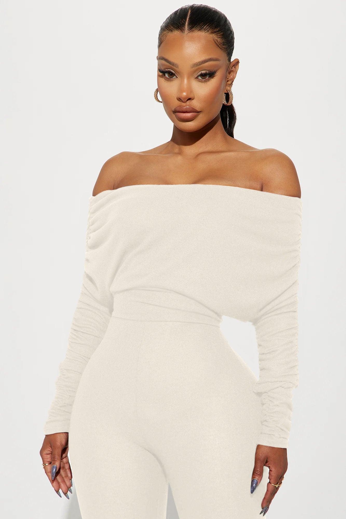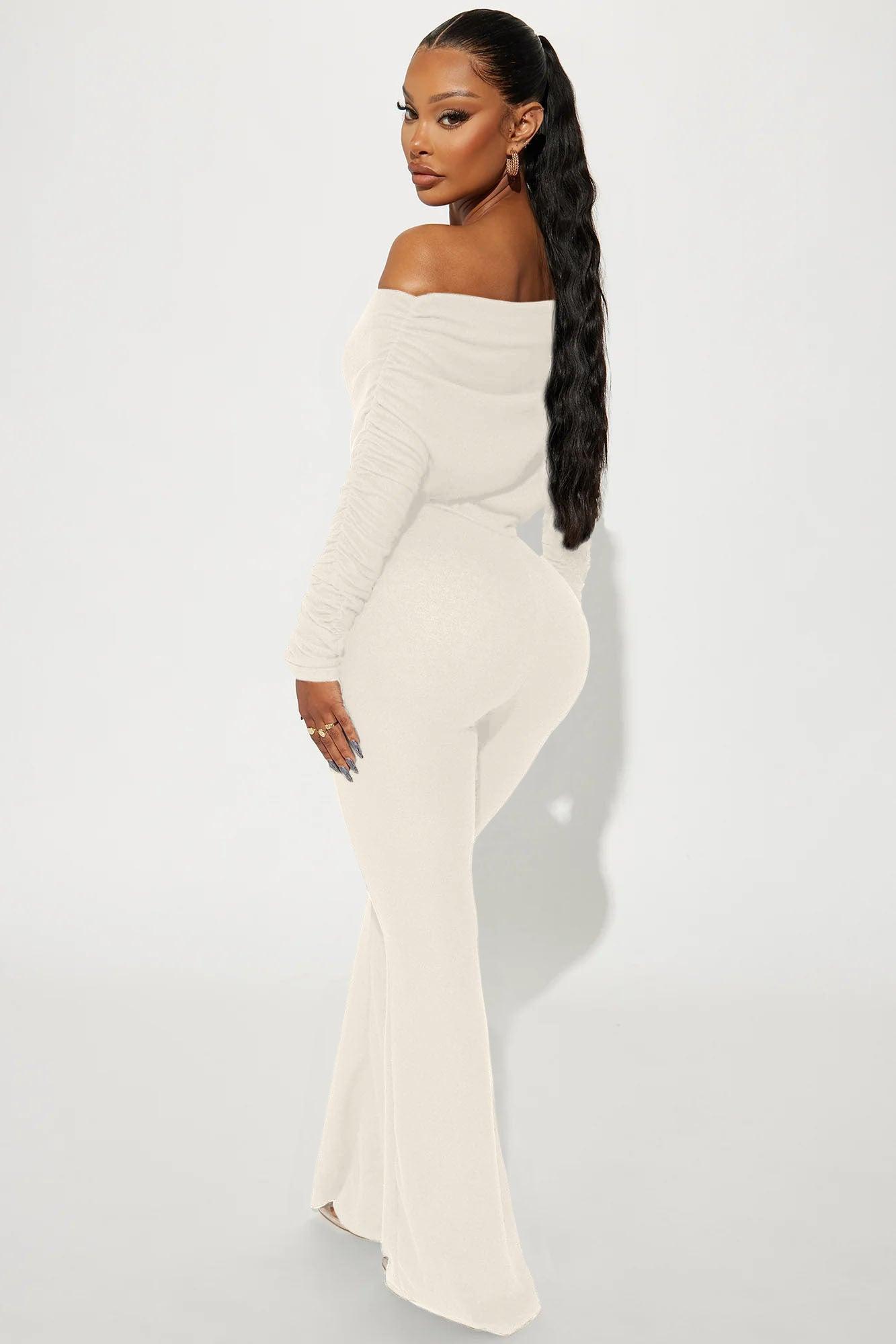 Available In Black And Cream. Jumpsuit Off The Shoulder Long Sleeve Ruched Detail Flare Leg Stretch Inseam = 34" 72% Rayon 21% Polyester 7% Spandex Imported