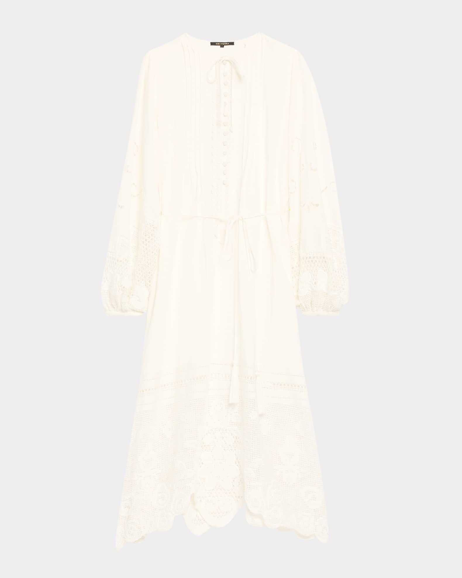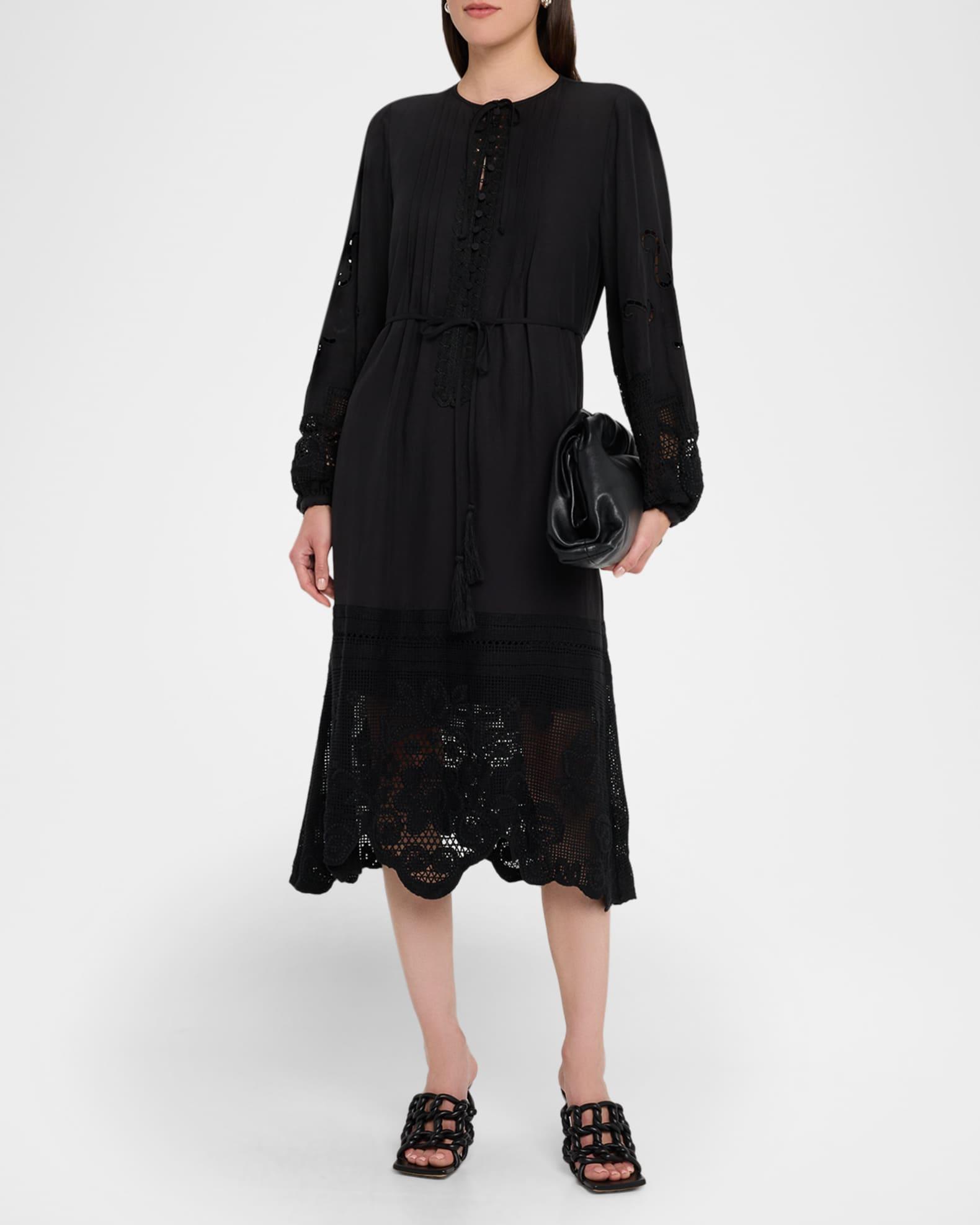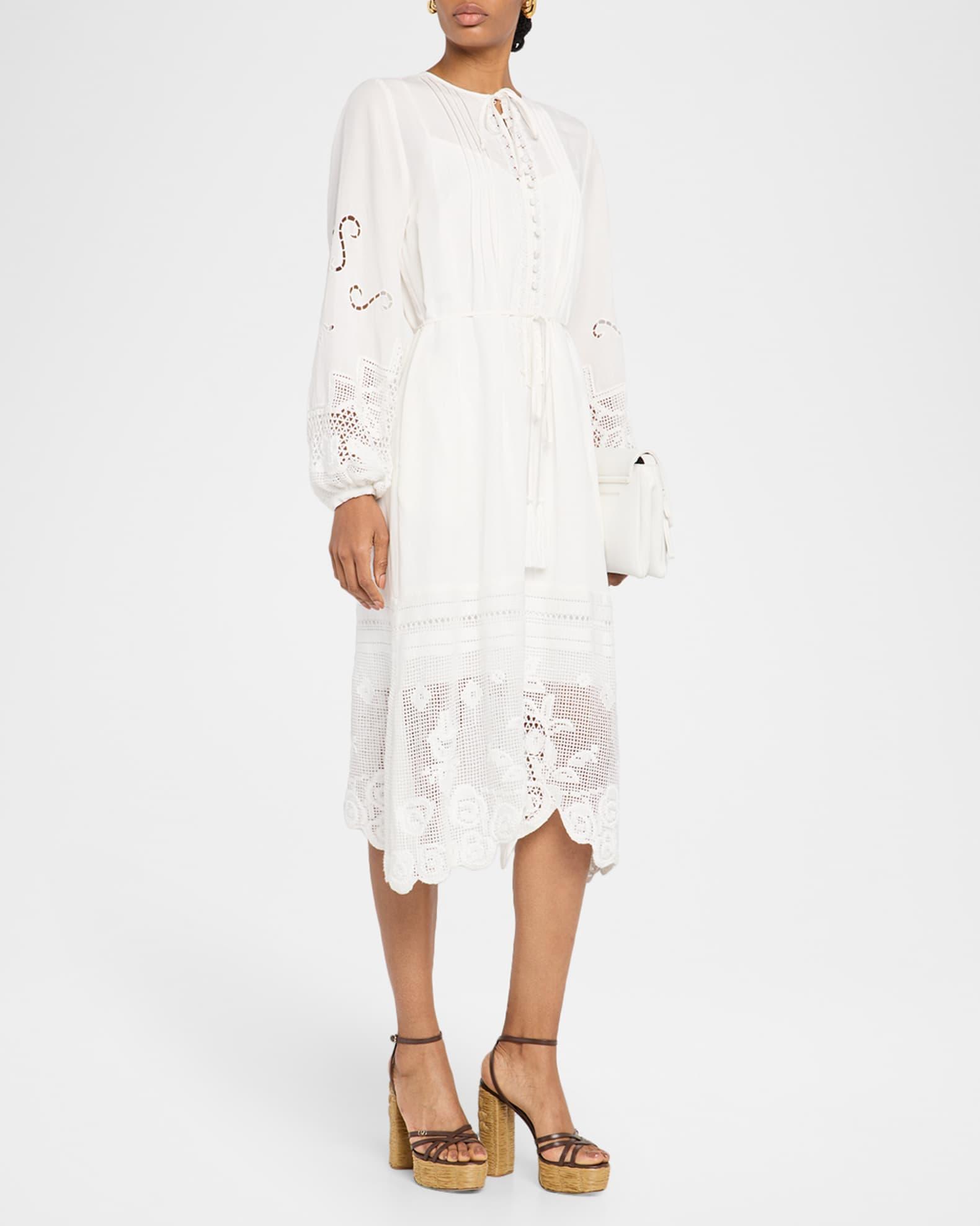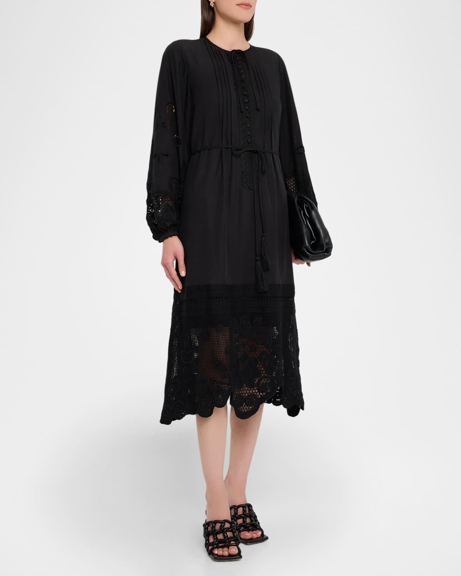 Kobi Halperin "Yelle" midi dress elevated with pintucks, scalloped lace trim, and floral lace inset Approx. 48"L from shoulders to hem Jewel neckline; front self-tie Button front placket Long blouson sleeves Button cuffs Tasseled waist self-tie Scalloped hem Hem falls below the knee A-line silhouette Linen Lining: Polyester Dry clean Imported Shipping Direct from Vendor, usually ships within 7 business days.