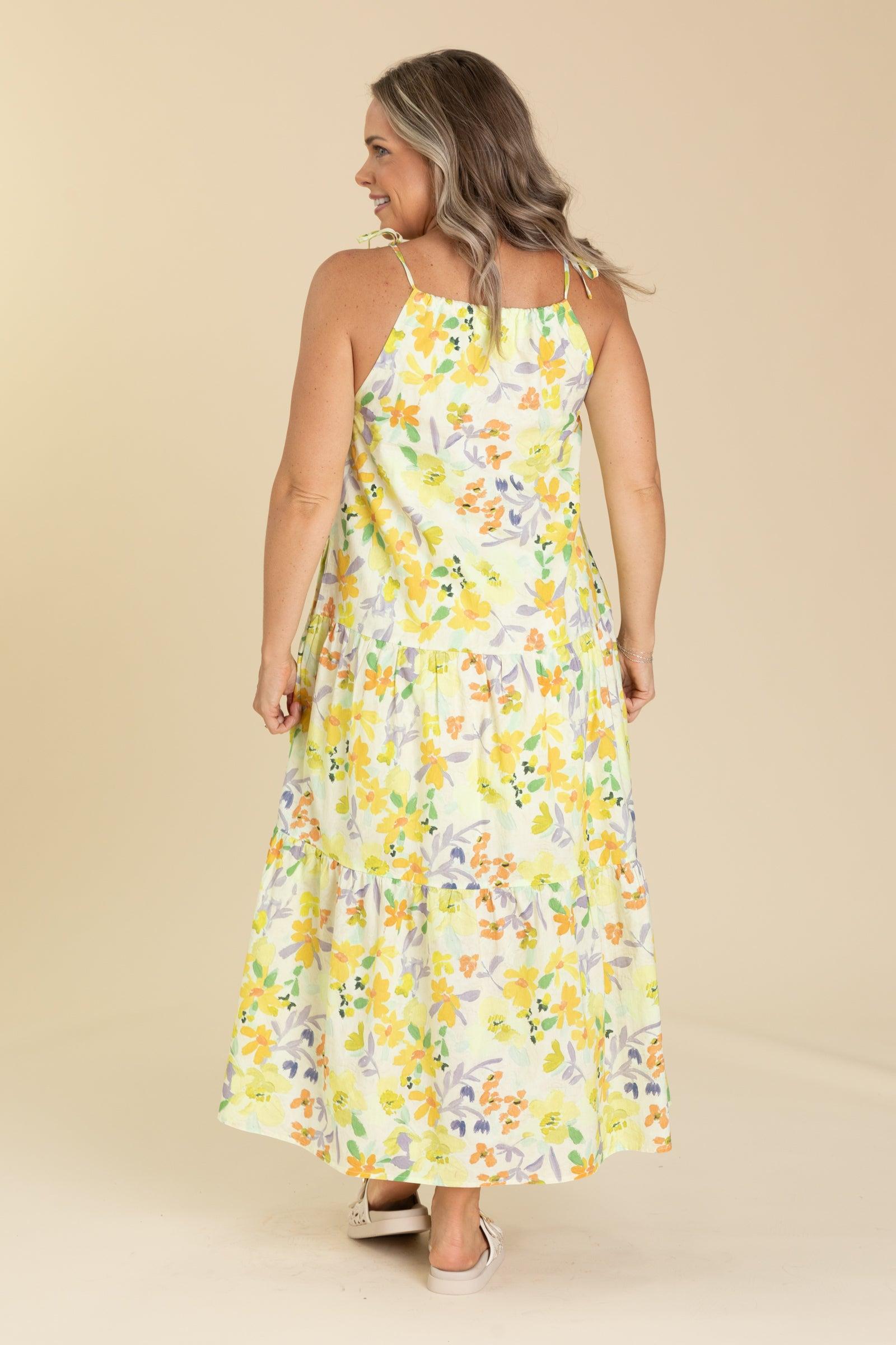 Product Details Colors: Yellow, Green, Light Coral, Lime, Lavender, Mint Print: Floral Neckline: Round Sleeve: Sleeveless Hemline: Straight Brand: LOVELO Material and Care Self: 100% Cotton Lining: 100% Polyester Hand Wash Cold Hang/Line Dry Size and Fit Adjustable Shoulder Tie Straps Small: Bust 38" Waist 40" Length 47" Medium: Bust 40" Waist 42" Length 48" Large: Bust 42" Waist 44" Length 49" Erica is 5’7” and wearing her true size small