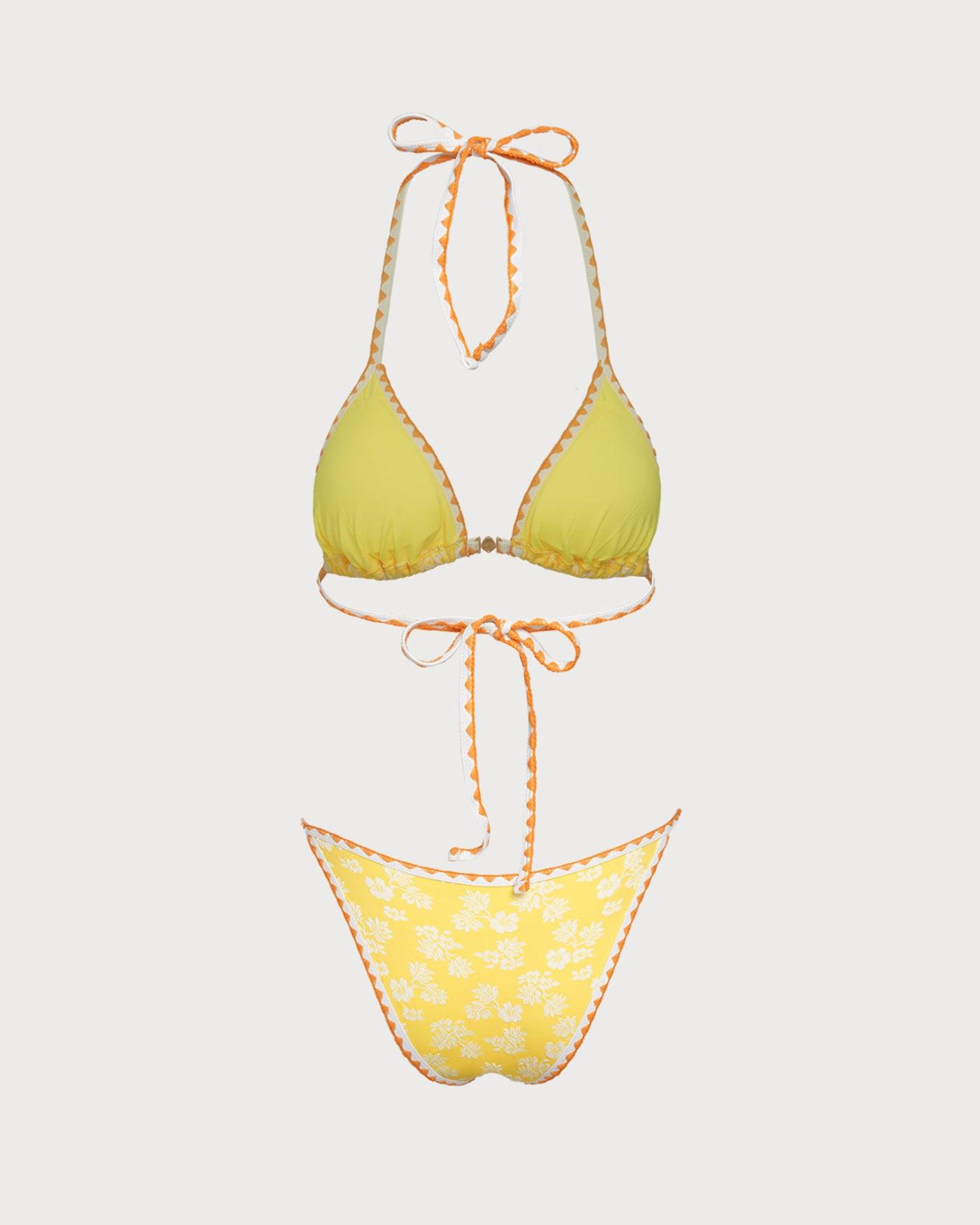 - Back Neckline: Strappy - Fabric Stretch: High Stretch - Waist: Low Waisted - Closure Type: Elastic Waist - Pattern Type: Floral, Plant - Embellishment: Elastic Waist, Knot, Tie, Textured, Jacquard - Neckline: Halter - Fabric: Polyester 92.0%, Spandex 8.0% - Lining: Polyester 90.0%, Spandex 10.0% - Leg Opening: High Cut Leg - Padding: Removable Soft Cups - Bottom Coverage: Moderate Bottom Coverage - Bra Coverage: Demi - Top Style: Triangle - Fabric Types(Pattern Style): textured