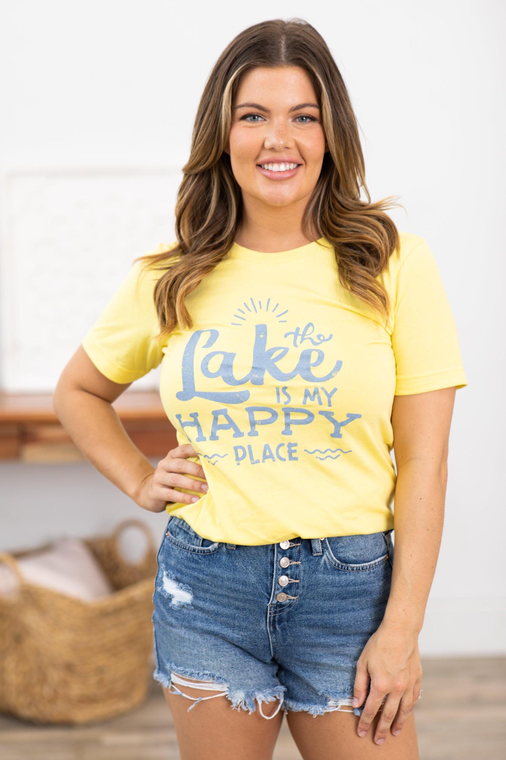 Product Details Colors: Yellow, Dusty Blue Print: Graphic Collar: Round Sleeve: Short Sleeves Hemline: Straight Material and Care 52% Cotton 48% Polyester Machine Wash Cold Tumble Dry Low Size and Fit Small: Bust 34" Waist 34" Length 28" Medium: Bust 38" Waist 38" Length 29" Large: Bust 42" Waist 42" Length 30" X Large: Bust 46" Waist 46" Length 31" Model is 5'4 and wearing a size small