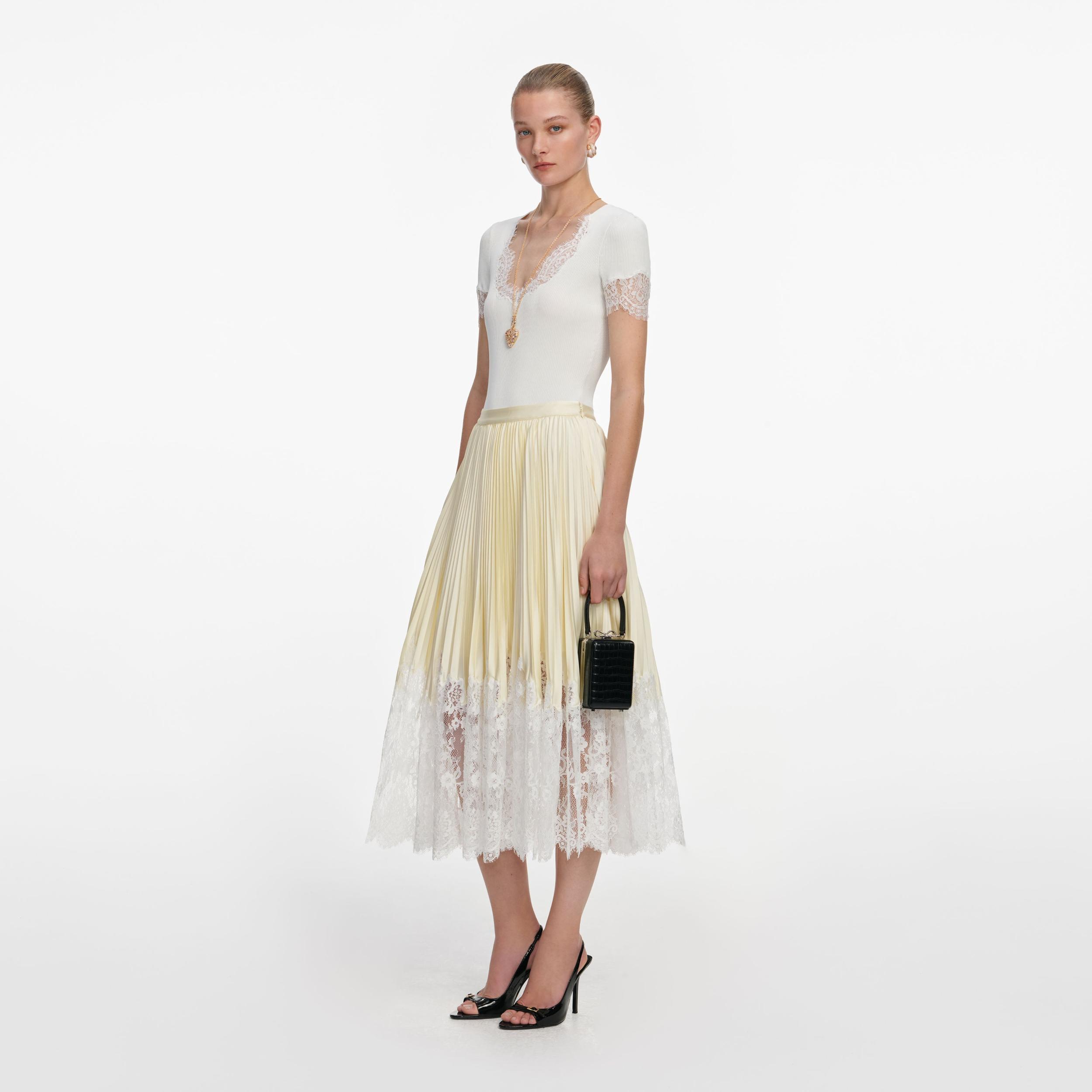 Radiant and romantic, intricate lace panelling adds lingerie-inspired cues to this yellow satin midi skirt. Style with a blazer for make-or-break meetings or wear with a slinky top for a hot date.Fitted styleThis style has minimal stretchConcealed zip closure at sideLace panellingFunctional pocketsModel is 5ft10/178cm and wears a size UK 6