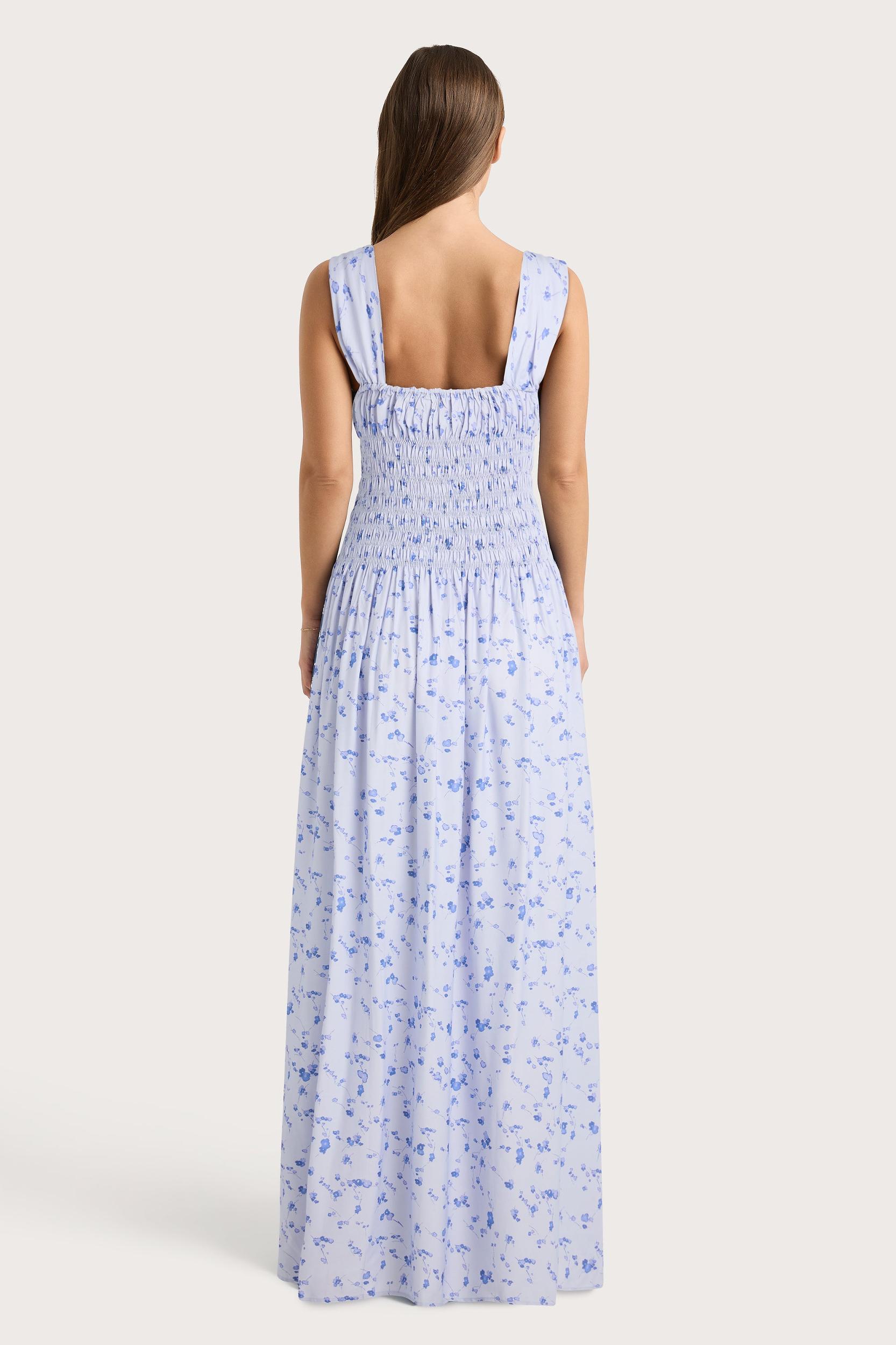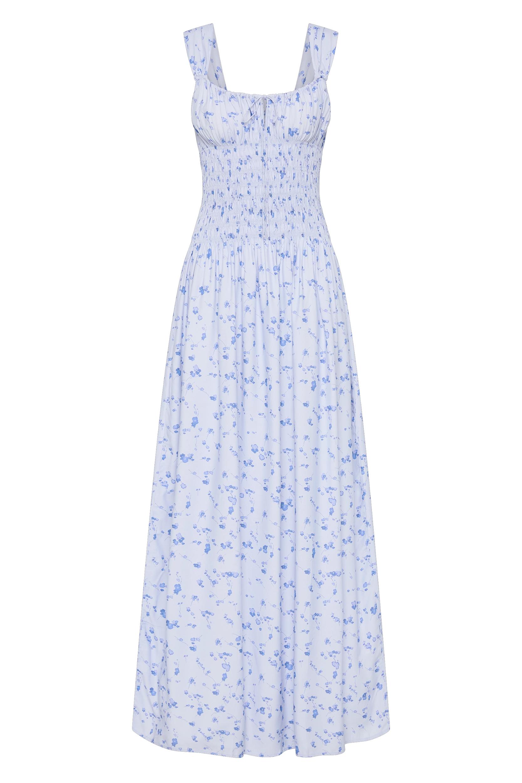 A sleeveless maxi dress with wide gathered straps and a tie detail at the bust. Designed from a soft rayon fabrication in a vintage-inspired blue floral motif, inspired by blossom flowers, it has a shirred waist that falls into a relaxed skirt with a slight A-line that crops below the knees. Feminine and signature FAITHFULL, it is designed with summer occasions in mind. This style is true to size. Please note additional stretch is offered through a gathered bust and shirred waist.