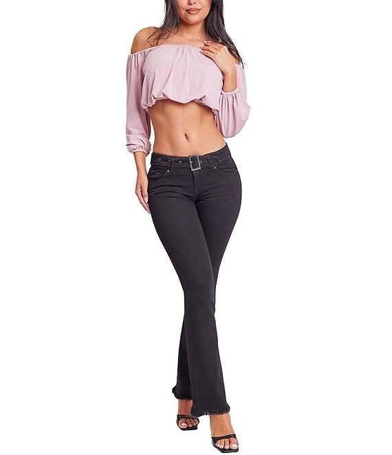 From YMI Jeanswear, these jeans feature: Low rise Belt buckle Zip fly with button closure 5-pocket styling Flare legs Approx. 33" inseam Cotton/polyester/spandex Machine wash/tumble dry Imported.