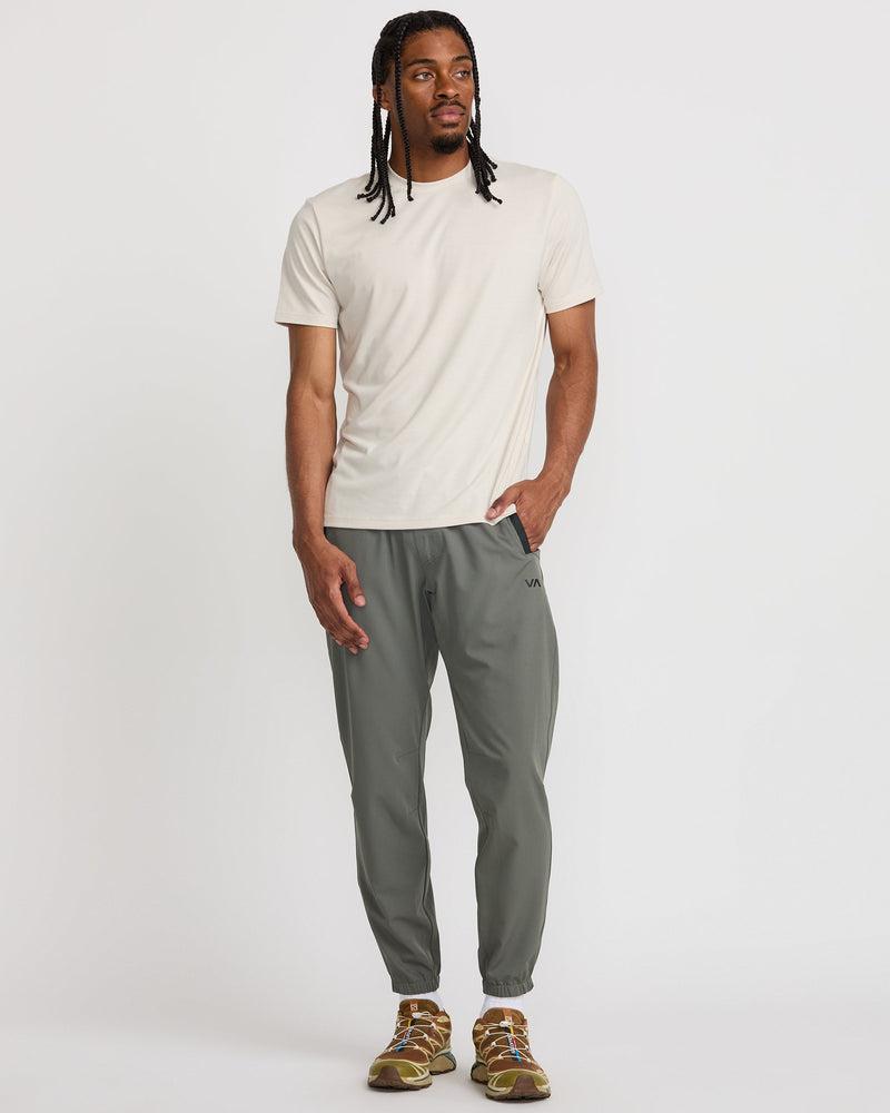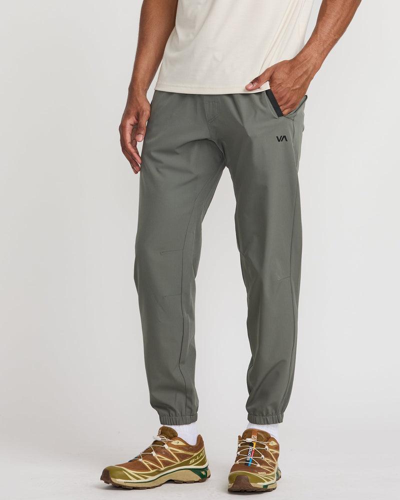 Low-key style meets performance-enhancing design in the RVCA Yogger Track Pants II. Made from premium 4-Way Stretch, these men's slim fit sweatpants feature an elastic drawcord waist, elastic cuffs, a built-in gusset panel at the crotch, front hand pockets and VA branding at the leg.