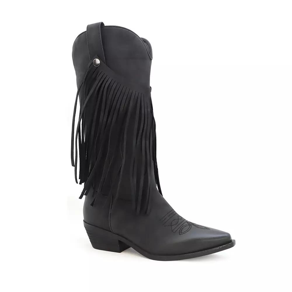 Step into a world of western charm with these chic fringe boots that are designed to make every outfit a little more spirited. With delightful fringe detailing and a comfy cushioned insole, you'll be ready to dance through life—whether you're pairing them with your favorite pair of jeans or twirling in a sundress. Click this FOOTWEAR GUIDE to find the perfect fit and more! - https://www.kohls.com/feature/shoesizeguide.jsp. FEATURES: Long fringe detailing, Classic stitching, Cushioned insole for all-day comfort, Low stacked heel, Water-resistant design. FIT & SIZE: Tall shaft, 10 inch boot shaft height, 18 inch boot shaft circumference. MATERIAL & CARE: Synthetic upper, Rubber outsole, Synthetic midsole, Synthetic lining, EVA footbed, Spot clean. DETAILS: Pull-on closure, Slip-resistant outsole, Pointed toe, Platform height: 1", Heel height: 1.5". Color: Black. Gender: female. Age Group: adult.