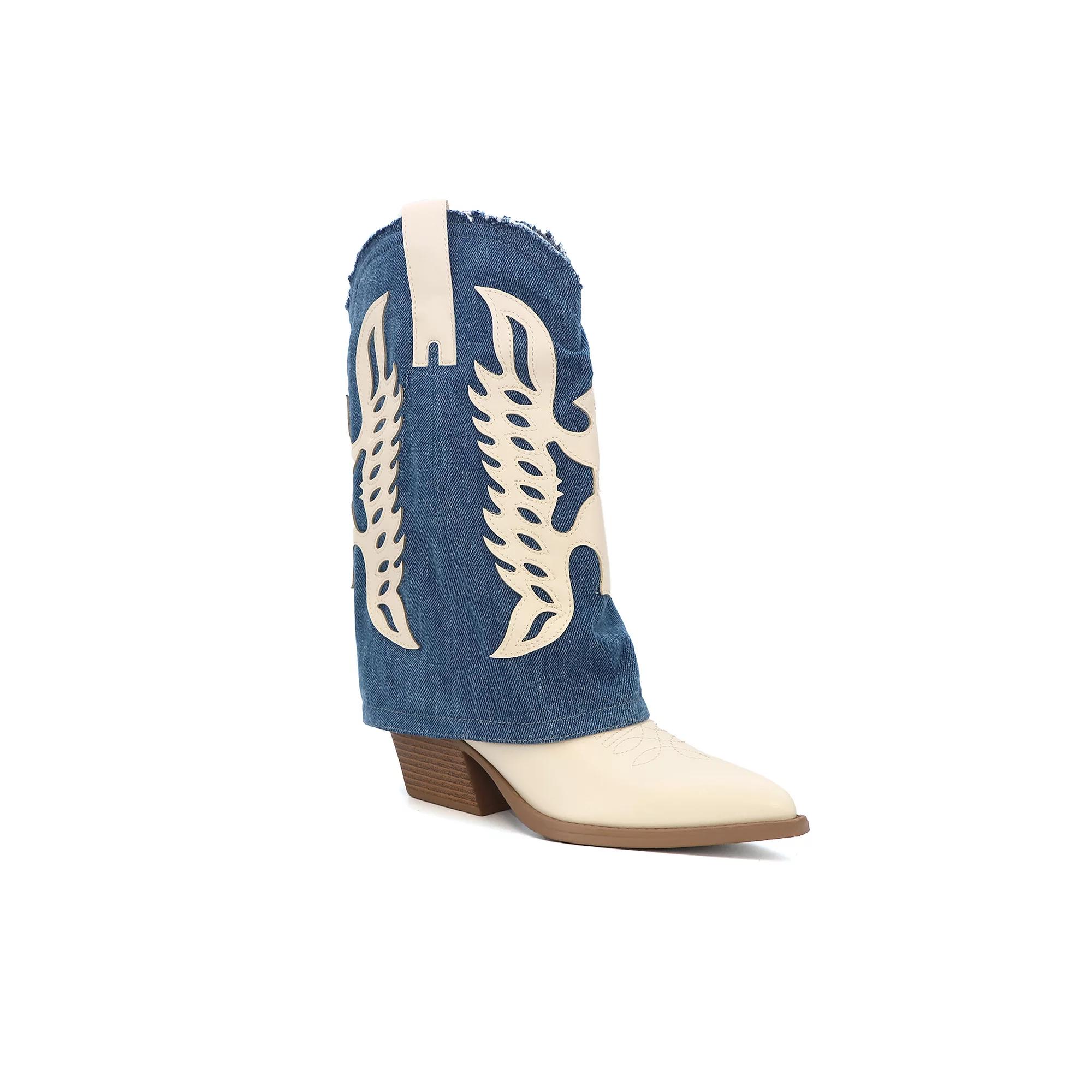 Unleash your inner cowgirl with the Yoki AVERY-05 boot, a fusion of classic western charm and contemporary flair. Featuring a statement two-tone design with frayed denim and smooth faux leather, this knee-high boot boasts a stylish foldover shaft and a pointed toe that effortlessly complements denim, skirts, or dresses, ensuring you're ready for any occasion, day or night. Click this FOOTWEAR GUIDE to find the perfect fit and more! - https://www.kohls.com/feature/shoesizeguide.jsp. FEATURES: Striking two-tone design with frayed denim and smooth faux leather, Foldover shaft for a relaxed edge, Pointed toe and slight block heel for a classic cowboy silhouette, Water-resistant for added durability. DETAILS: Pointed toe, Pull-on closure, Heel height: 1.5", Platform height: 1", Slip-resistant outsole, Imported. FIT & SIZE: Knee high shaft, 15 inch shaft circumference, 15 inch shaft height. MATERIAL & CARE: Synthetic upper, Synthetic lining, Synthetic midsole, Rubber outsole, Spot clean. Size: 7.5 Med. Color: Bone. Gender: female. Age Group: adult.