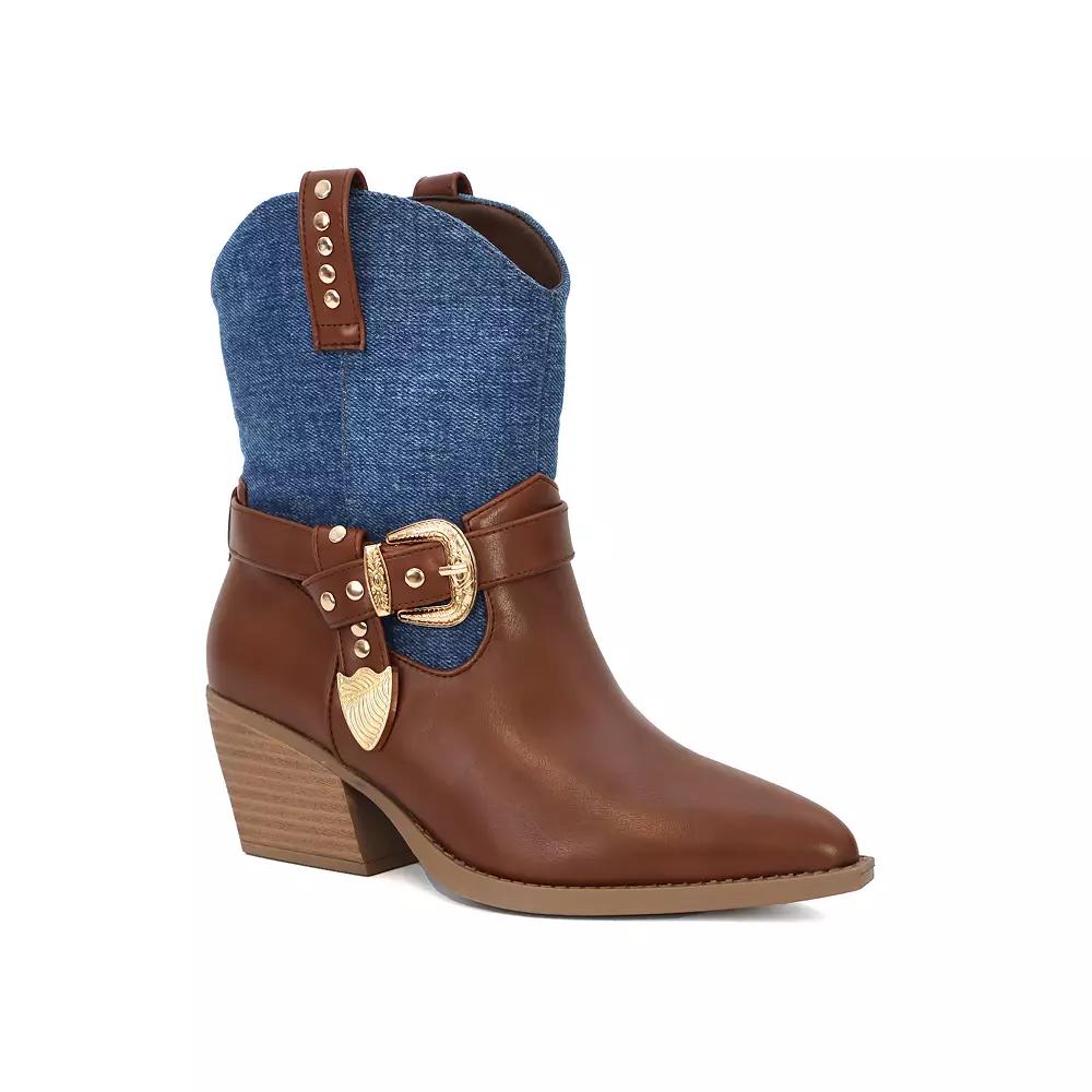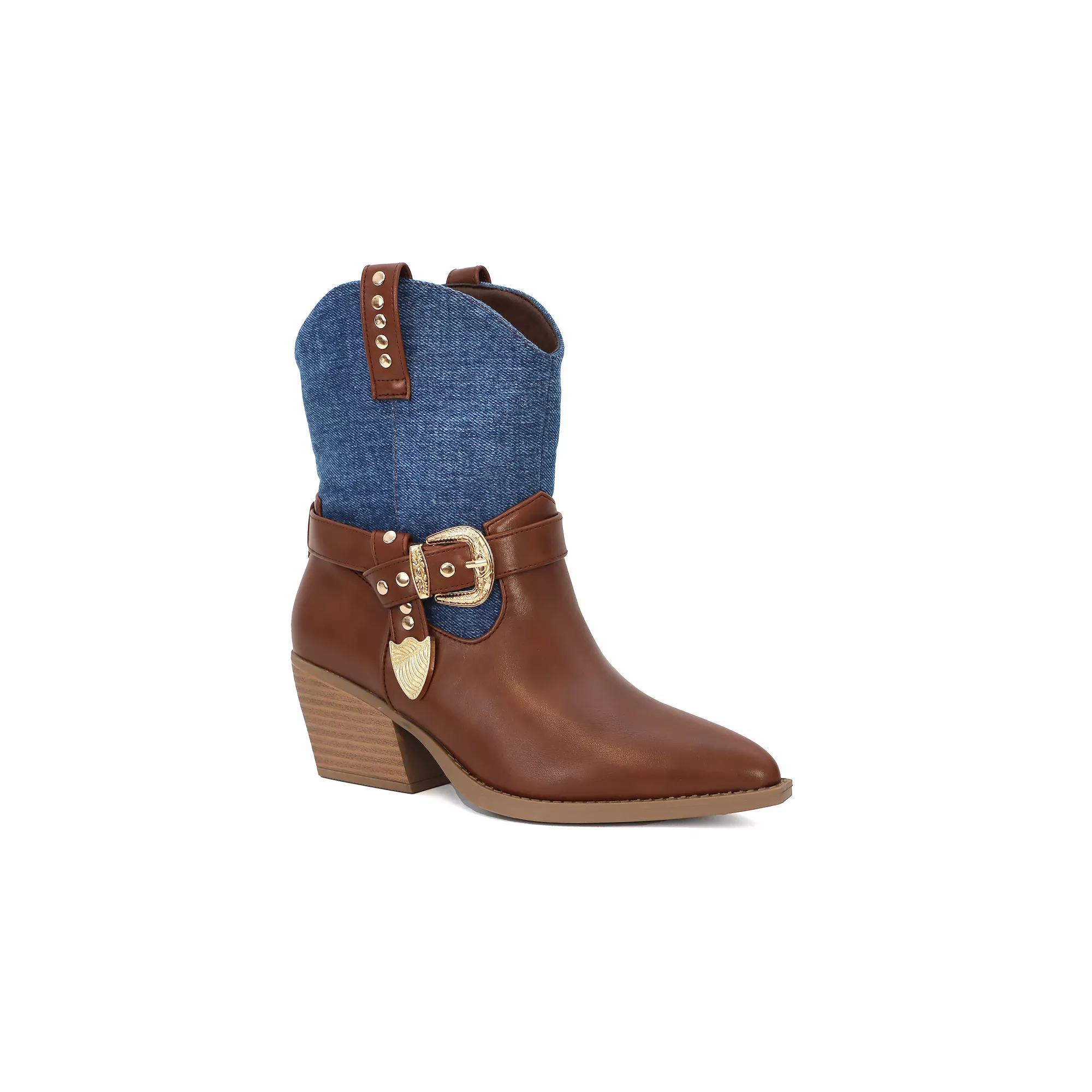 Channel your inner cowboy with Yoki's stylish ankle boot featuring dramatic elements like a decorative gold buckle and an eye-catching engraved metallic tip guard. With striking two-tone options and a comfortable design, these booties are perfect for turning heads at casual outings or adding flair to weekend adventures. Click this FOOTWEAR GUIDE to find the perfect fit and more! - https://www.kohls.com/feature/shoesizeguide.jsp. FEATURES: Bold western flair with decorative gold buckle and engraved metallic tip guard, Striking two-tone contrast with cow-print faux hair or rugged denim and smooth faux leather, Angled block heel and pointed toe for structure and style, Water-resistant design for added durability. DETAILS: Pointed toe, Pull-on closure, 1" heel height, 1" platform height, Slip-resistant outsole, Imported. FIT & SIZE: Mid-calf boot shaft, 15 inch shaft circumference, 15 inch shaft height. MATERIAL & CARE: Synthetic upper, Synthetic lining, Synthetic midsole, Rubber outsole, Spot clean. Size: 7.5. Gender: female. Age Group: adult.