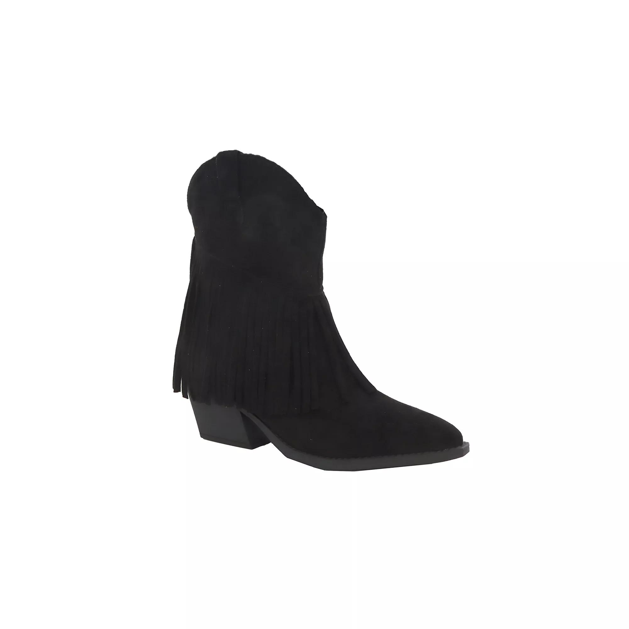 Make a statement with the GAYLE-69 bootie by Yoki, a perfect blend of western charm and bohemian spirit. With its eye-catching fringe, pointed toe, and comfortable low stacked heel, these booties are ideal for music festivals or turning heads during weekend outings. Click this FOOTWEAR GUIDE to find the perfect fit and more! - https://www.kohls.com/feature/shoesizeguide.jsp. FEATURES: All-over fringe design that sways with every step, Pointed toe and slanted mid shaft for a flattering silhouette, Water-resistant construction for added durability, Pull-on tabs for easy wear. DETAILS: Pointed toe, Pull-on closure, 1" heel height, 1" platform height, Slip-resistant outsole, Imported. FIT & SIZE: Mid-calf boot shaft, 15 inch boot shaft circumference, 15 inch boot shaft height. MATERIAL & CARE: Spot clean, Rubber outsole. Size: 10. Color: Black. Gender: female. Age Group: adult. Material: SYNTHETIC.