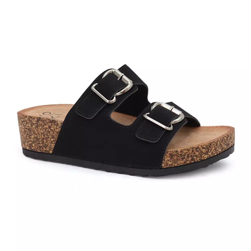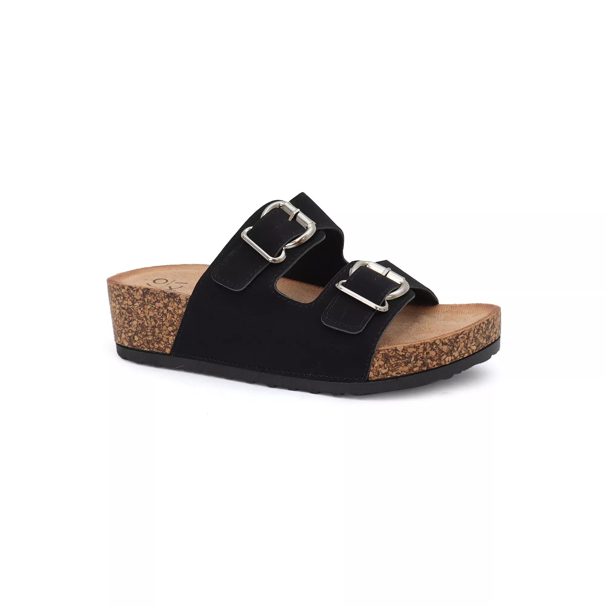 Step into comfort and style with these Yoki Lorayn-10 women's wedge slip-on sandals. Click this FOOTWEAR GUIDE to find the perfect fit and more! - https://www.kohls.com/feature/shoesizeguide.jsp. FEATURES: Water-Resistant, Double buckle straps for a custom-like fit, Foam footbed for all day comfort, Slip-on for easy on and off. DETAILS: Faux suede upper, lining and outsole, Rubber midsole, Open toe, Slip-on, Foam footbed, 2-in. heel, 1-in. platform, Spot clean, Imported. Size: 6.5. Color: Black. Gender: female. Age Group: adult. Material: SYNTHETIC.