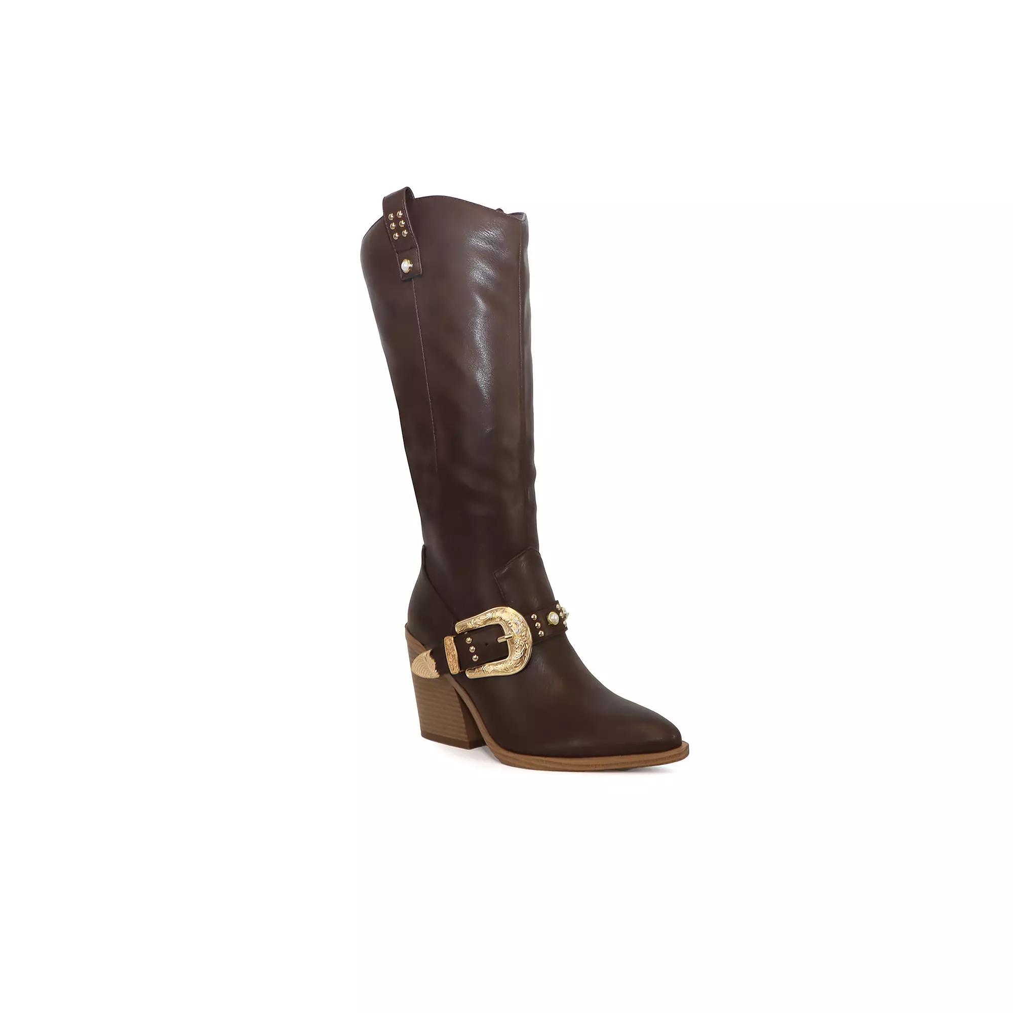 Step into a world of western charm with these stylish boots that effortlessly blend classic and contemporary. The tall silhouette, bold gold buckle, and pointed toe not only give you a flattering look but promise to make heads turn, whether you're strutting in jeans or twirling in a dress. Click this FOOTWEAR GUIDE to find the perfect fit and more! - https://www.kohls.com/feature/shoesizeguide.jsp. FEATURES: Tall silhouette with bold gold buckle strap, Studded accents for a modern edge, Pointed toe for a flattering look, Stacked block heel for added style, Pull-on design for easy wear, Water-resistant for added protection. FIT & SIZE: Knee high boot shaft, 12-in. boot shaft height, 20-in. boot shaft circumference. MATERIAL & CARE: Synthetic upper, midsole & lining, Rubber outsole, EVA footbed, Spot clean. DETAILS: Zipper closure, Slip-resistant outsole, Pointed toe, 1-in. platform height, 3-in. heel height. Size: 8. Color: Brown. Gender: female. Age Group: adult.