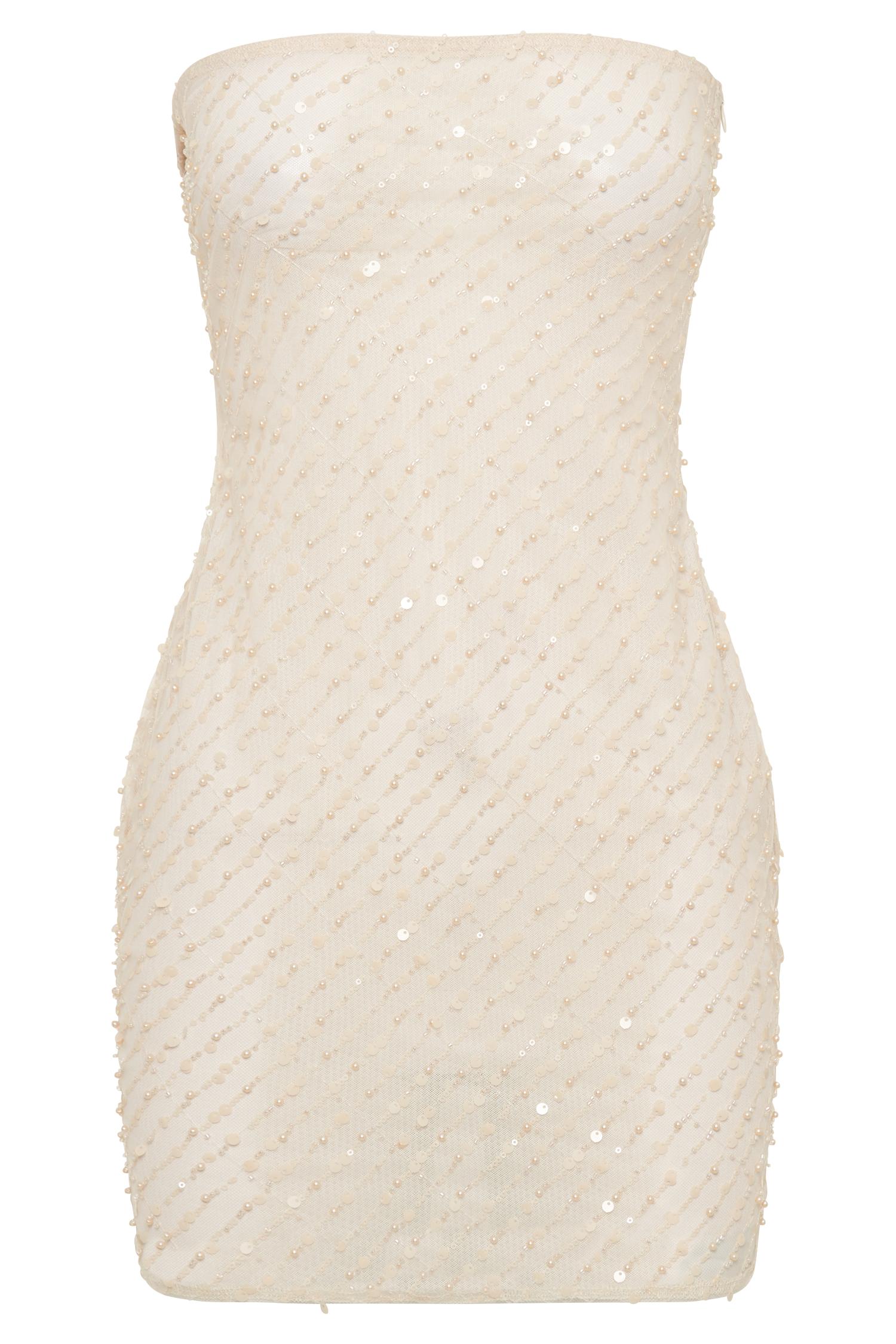 Everything to see here. The YOLANDA Sequin Mini is a strapless bodycon dress cut into a flattering mini length and draped to celebrate your figure. Crafted from a glittering sequin fabric, it sparkles and shines with every movement, ensuring you stand out from the crowd. While slightly sheer for a hint of allure, it's fully lined for comfort and coverage. Pair with the CAITLIN Diamante Rope Heels to complete the look. This dress is considered a Micro Mini Dress and measures shorter than 82cm from shoulder point.