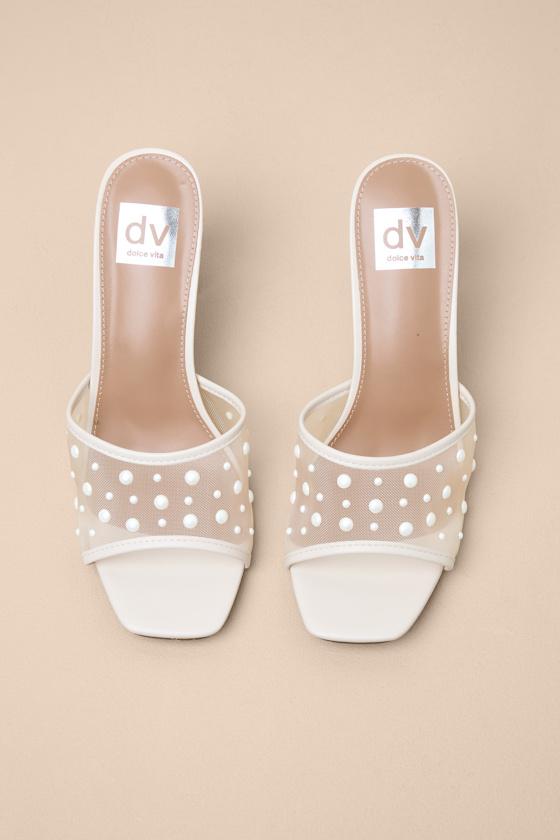 Ready to strut through treasured moments and crowded dancefloors, these luxe sandals by DV by Dolce Vita feature a convenient slide-on design for effortless styling. Luminous faux pearl accents adorn a sheer mesh vamp strap that tops the modern square footbed, all atop a party-perfect sculptured heel.