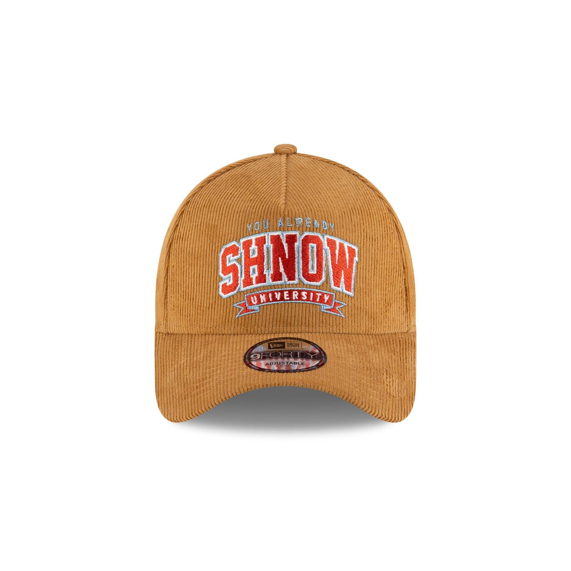 The You Already Shnow University Wheat Cord 9FORTY A-Frame Snapback features an embroidered Shnow University wordmark at the front panels with a Buffalo above a snapback closure at the rear and a green undervisor.
