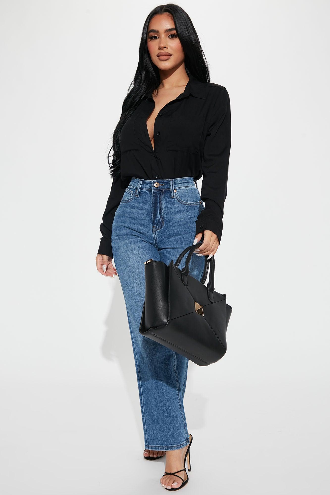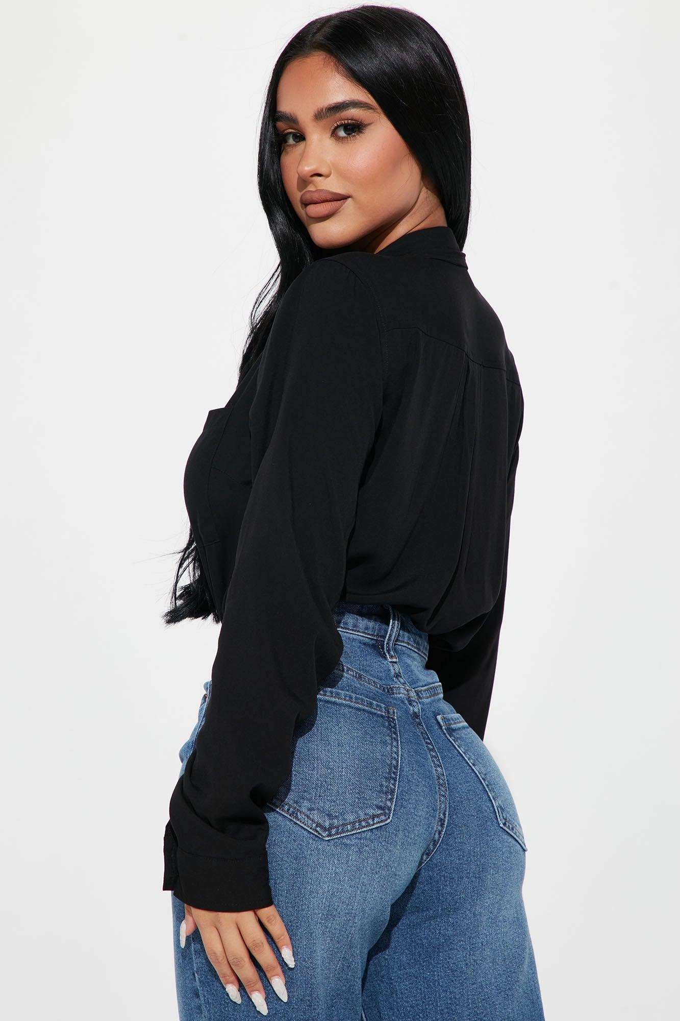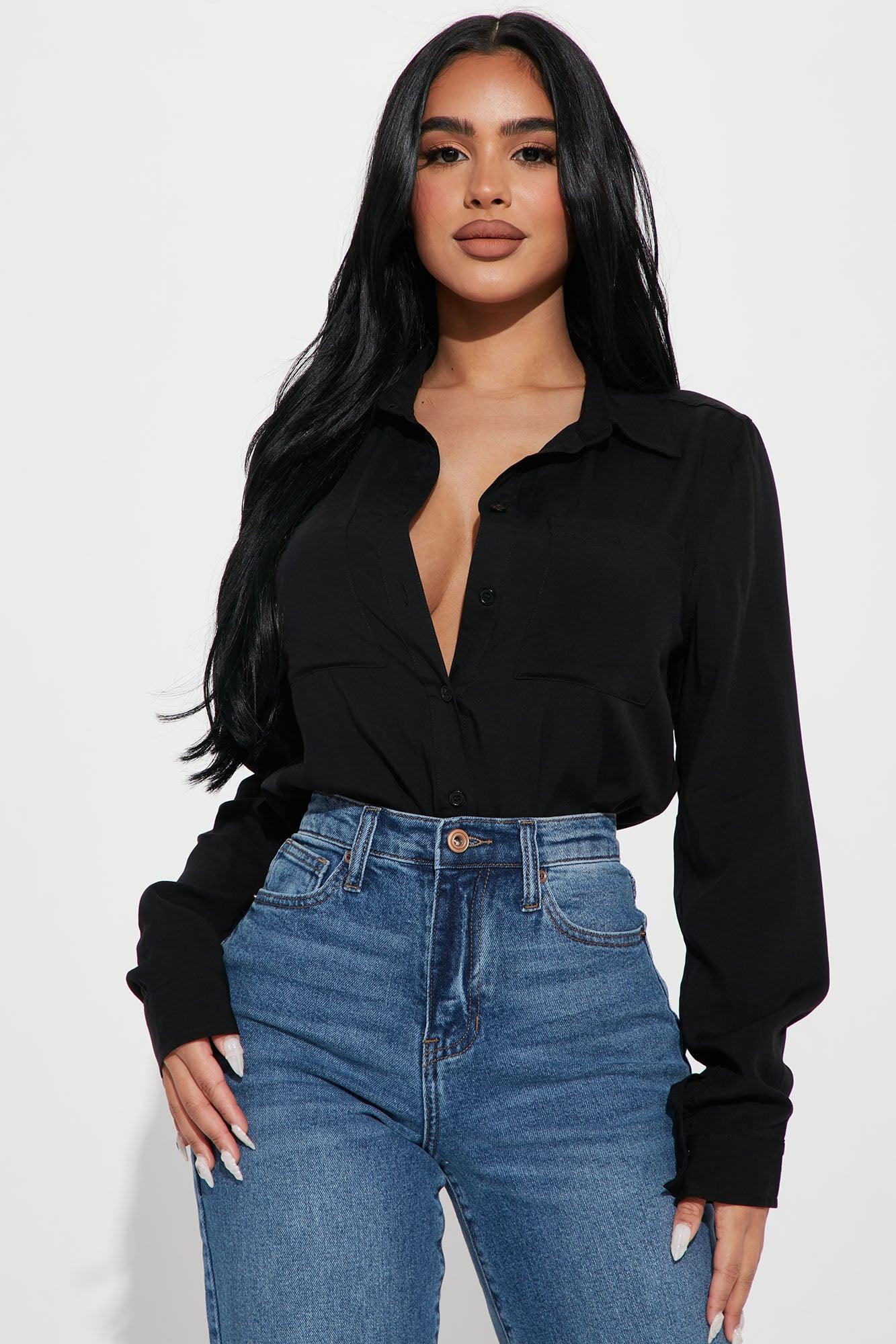 Available In Black, Blue, Blush, Chocolate And White. Shirt Bodysuit Long Sleeve Button Front Front Pockets Button Cuffs Cheeky Bottom Snap Button Closure Final Sale Self: 100% Rayon Contrast: 95% Polyester 5% Spandex Imported California Proposition 65WARNING: Cancer and Reproductive Harm - www.P65Warnings.ca.gov.
