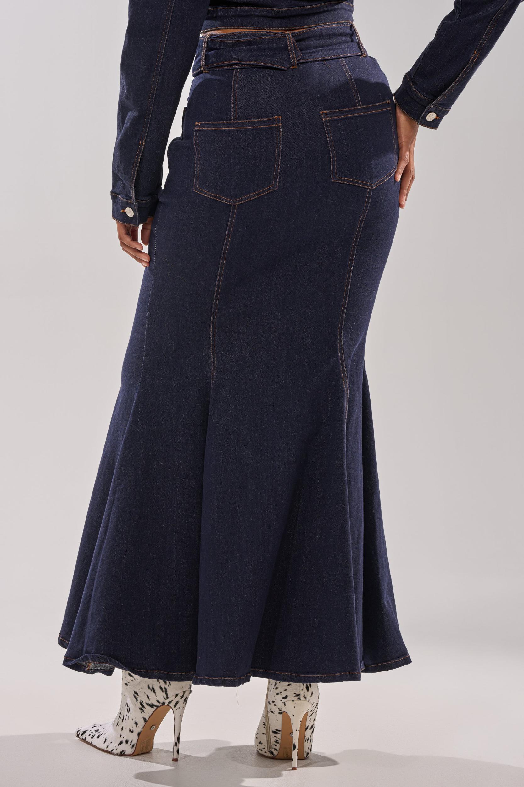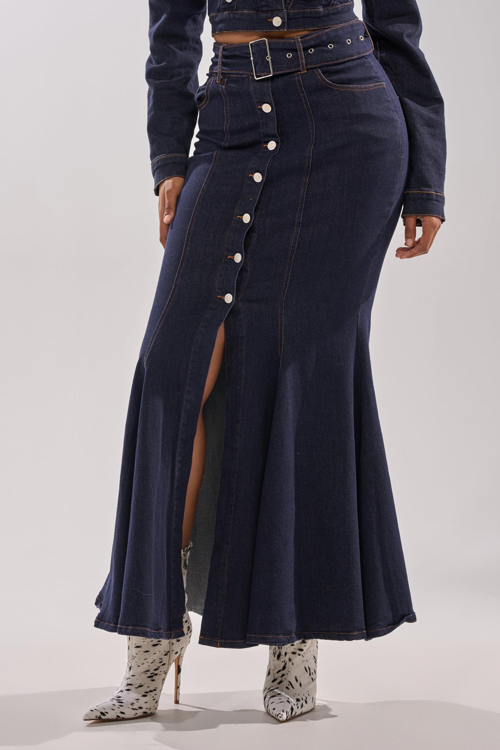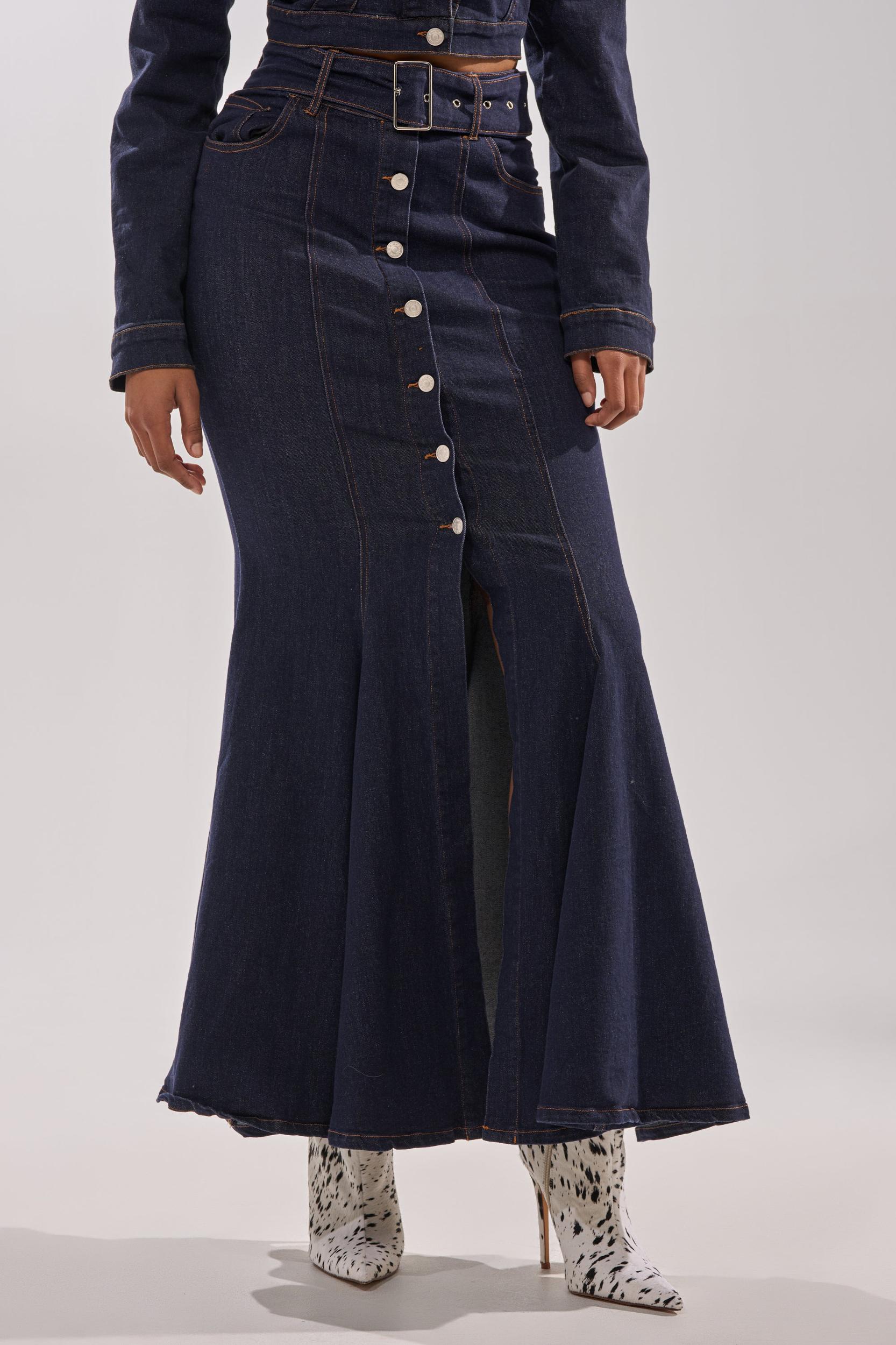 Head in the clouds, got no weight on your shoulders! The AKIRA Label You Got Me Spinning Denim Maxi Skirt is crafted from a semi-stretchy, dark-wash denim with a flattering mermaid silhouette. It features a high-rise waist, a coordinating adjustable waist belt, a classic five-pocket design, a panel of silver button-front closures, and a concealed side zip closure. Complete with a maxi-length silhouette and a soft flare at the hemline. Style it with the matching AKIRA Label You Got Me Spinning Denim Button Down, moto boots, and chunky jewelry for an elevated denim-on-denim finish. - 65% Cotton 30% Polyester 3% Viscose 2% Spandex- Slight Stretch- Imported (all measurements approximate from size small)- 42” Waist to Hem- Model is 5’9” and is wearing size smallProduct ID: 1063024
