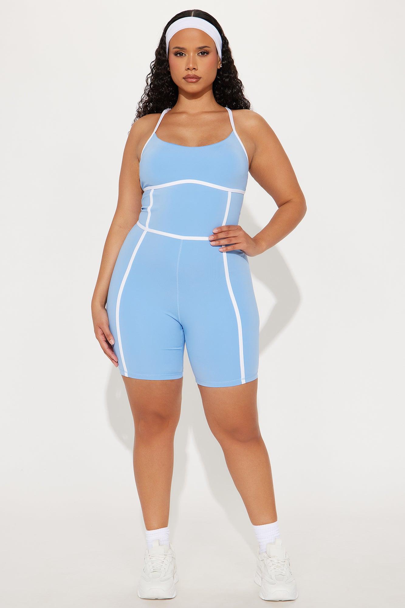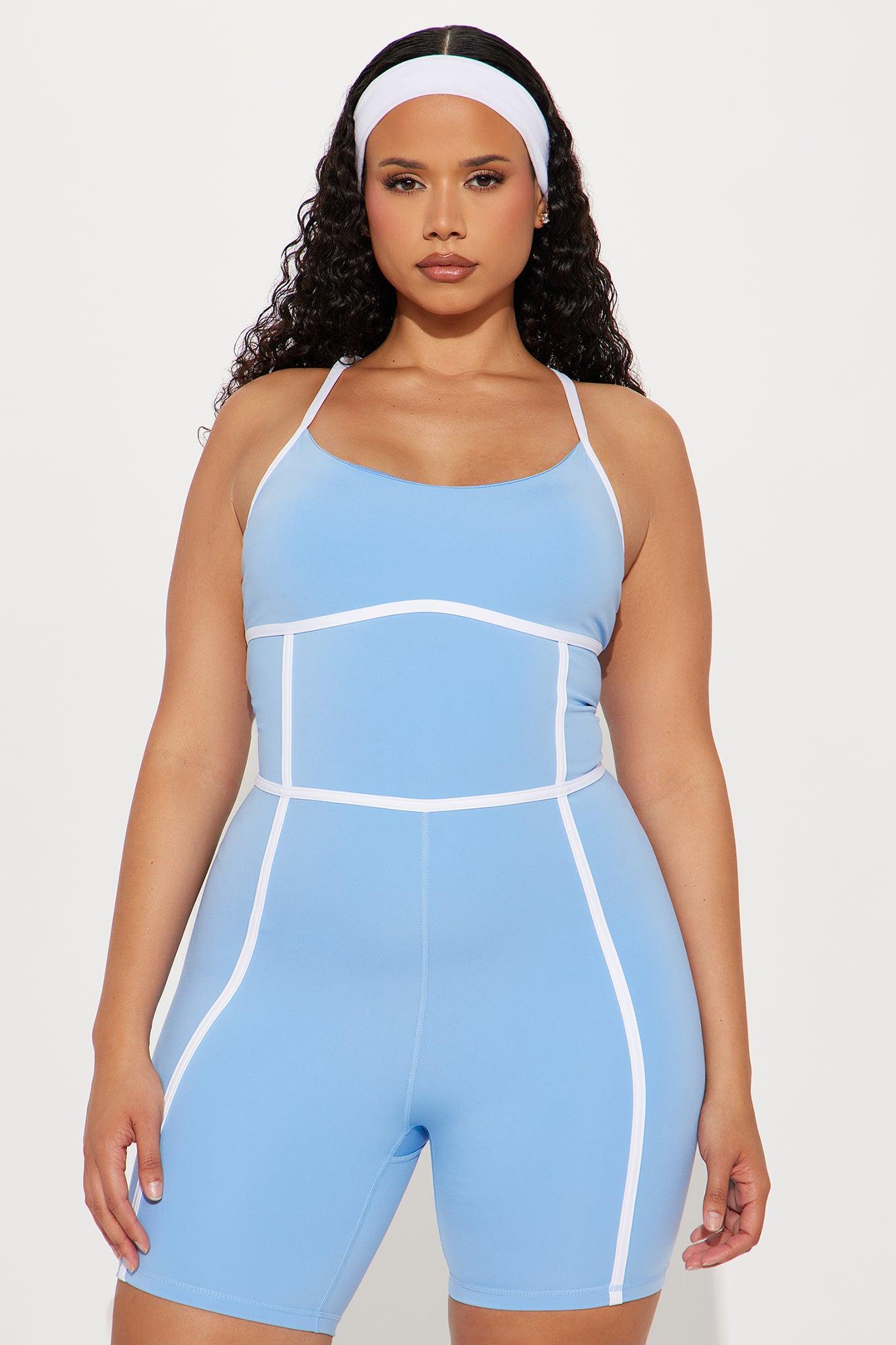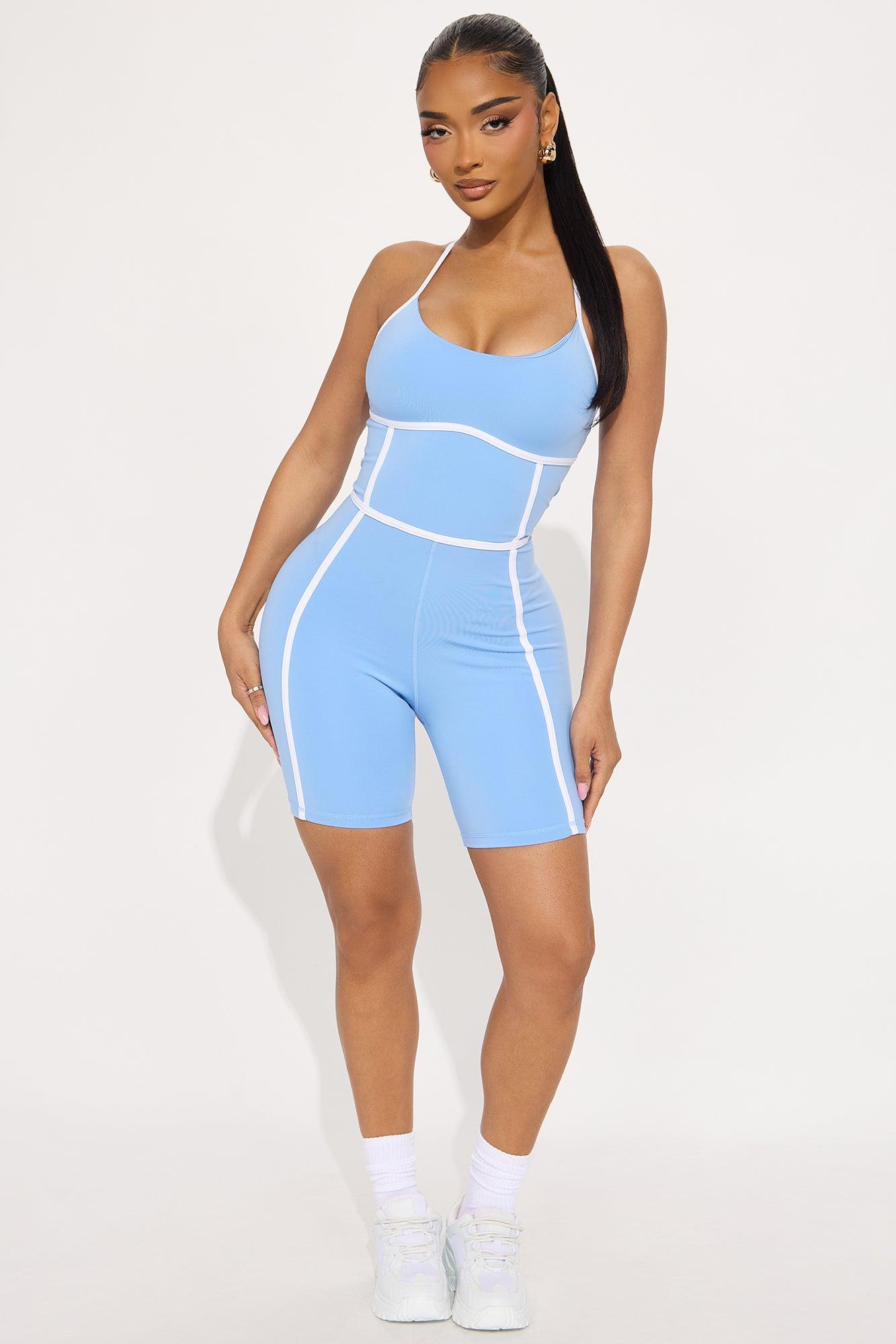 Available In Black, Butter Yellow And Light Blue. Active Romper Scoop Neck Sleeveless Compression Contrast Trim Strappy Detail 9" Inch Inseam Low Impact Stretch Self: 76% Polyester 24% Spandex Lining: 95% Polyester 5% Spandex Imported California Proposition 65WARNING: Cancer and Reproductive Harm - www.P65Warnings.ca.gov.
