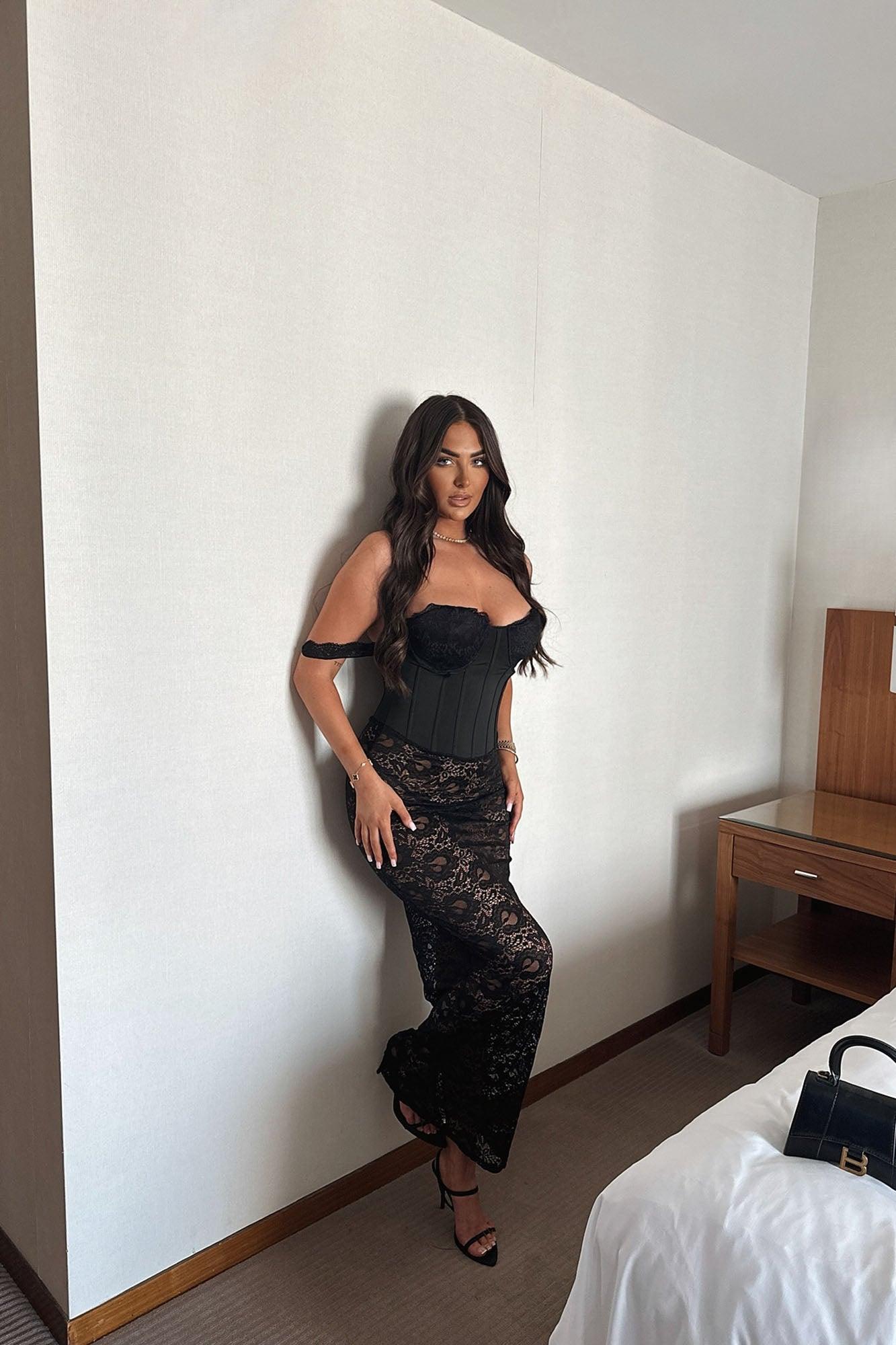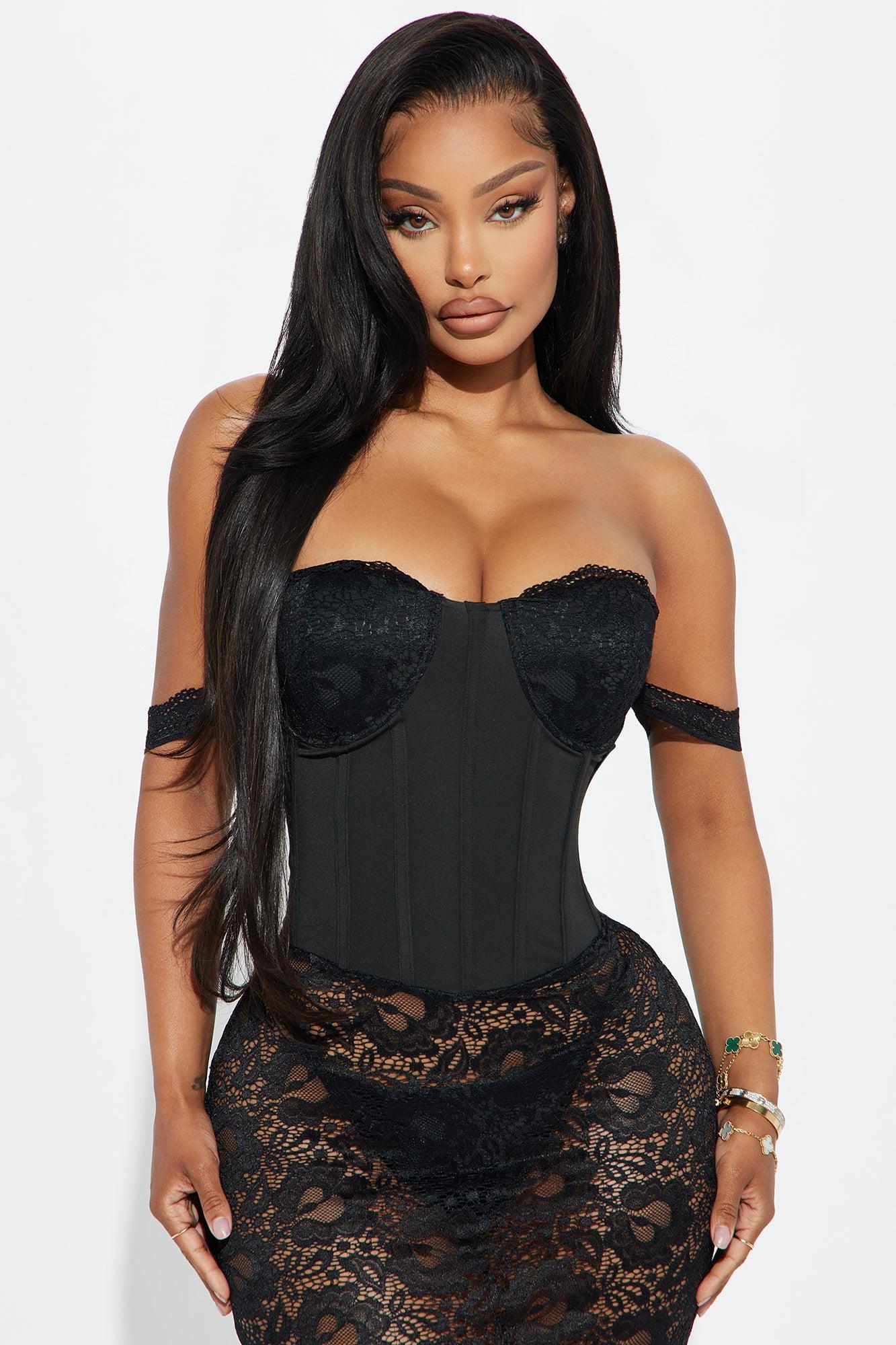 Available In Black. Lace Maxi Dress Off the shoulder Sleeveless Includes underwear Padded bra cups Corset waist Lace up back Stretch Final Sale Shell 1: 90% Nylon 10% Spandex Shell 2: 80% Polyester 20% Spandex Panties: 95% Polyester 5% Spandex Imported