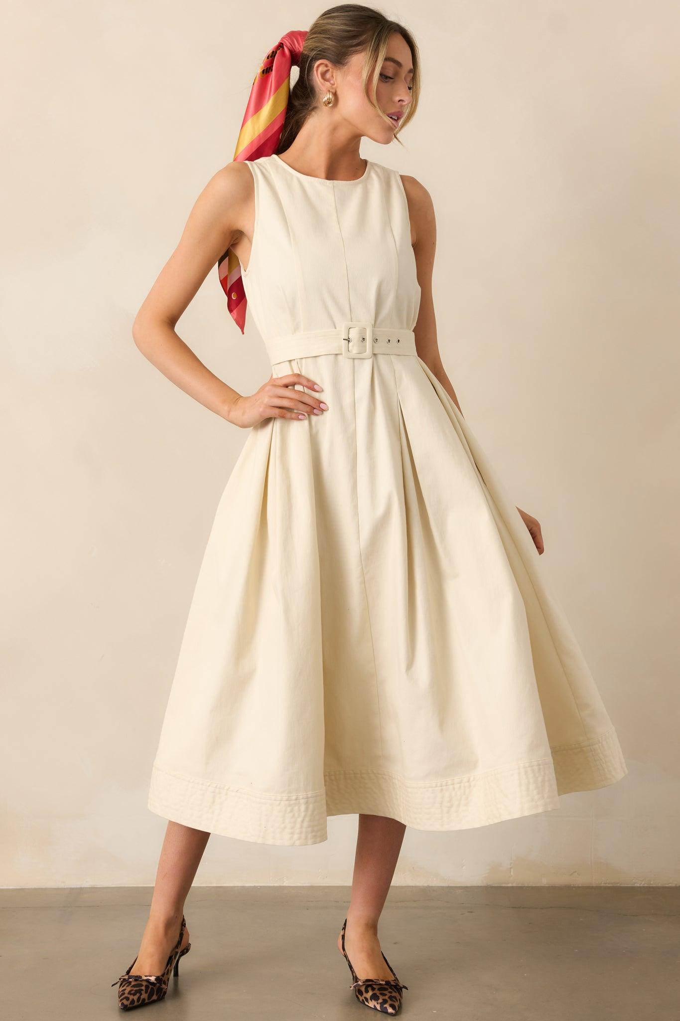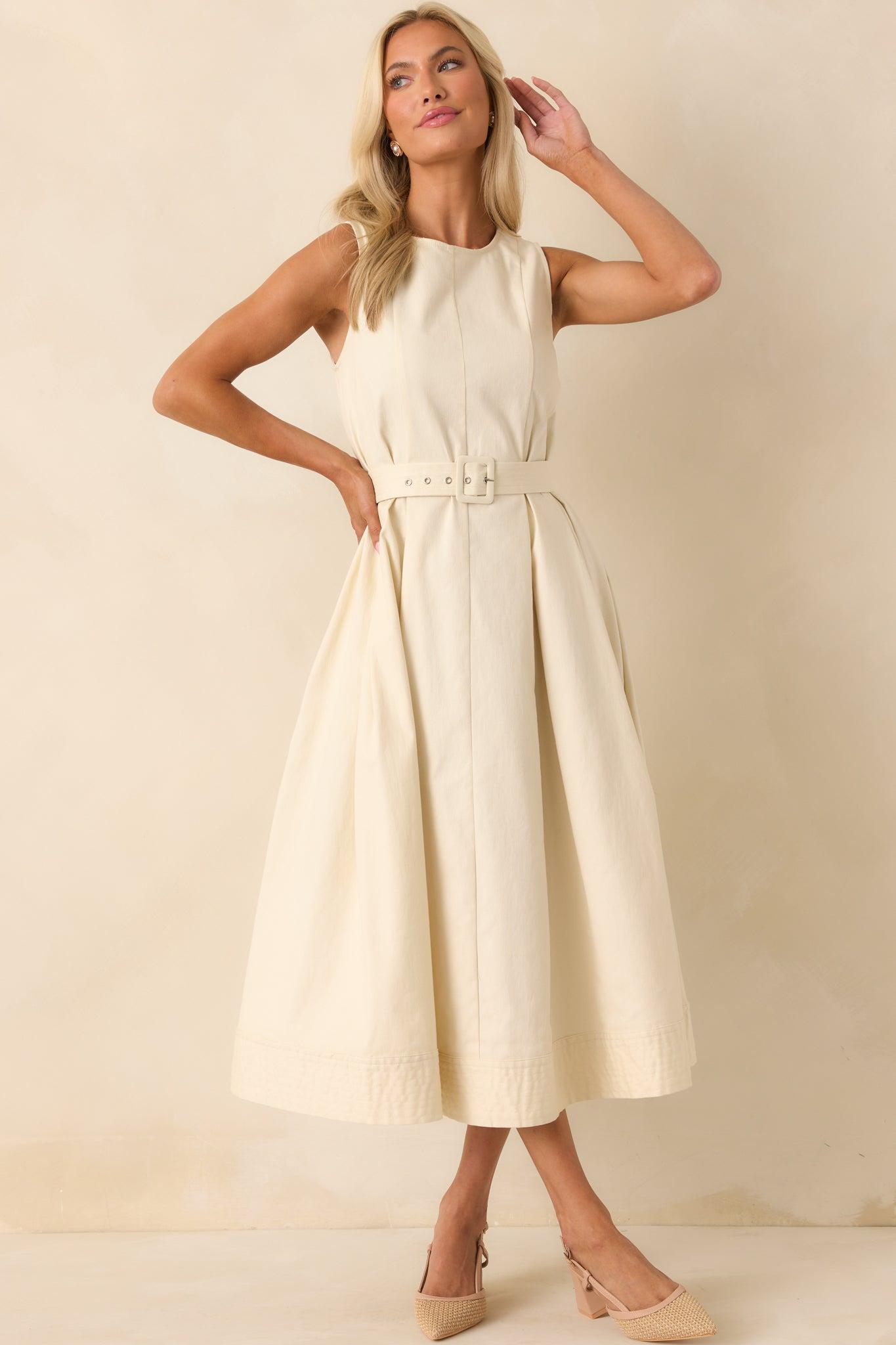 Step into the world feeling young at heart with this elegant belted sleeveless midi dress. The ecru color adds a touch of sophistication, while the belted waist accentuates your figure. The perfect dress for any occasion! This ecru dress features a rounded neckline, panel stitching, discrete back zipper, quilted bottom hem, belted waistline, and sleeveless design.
