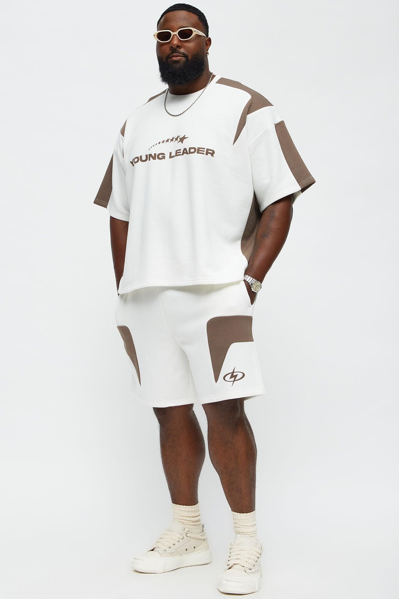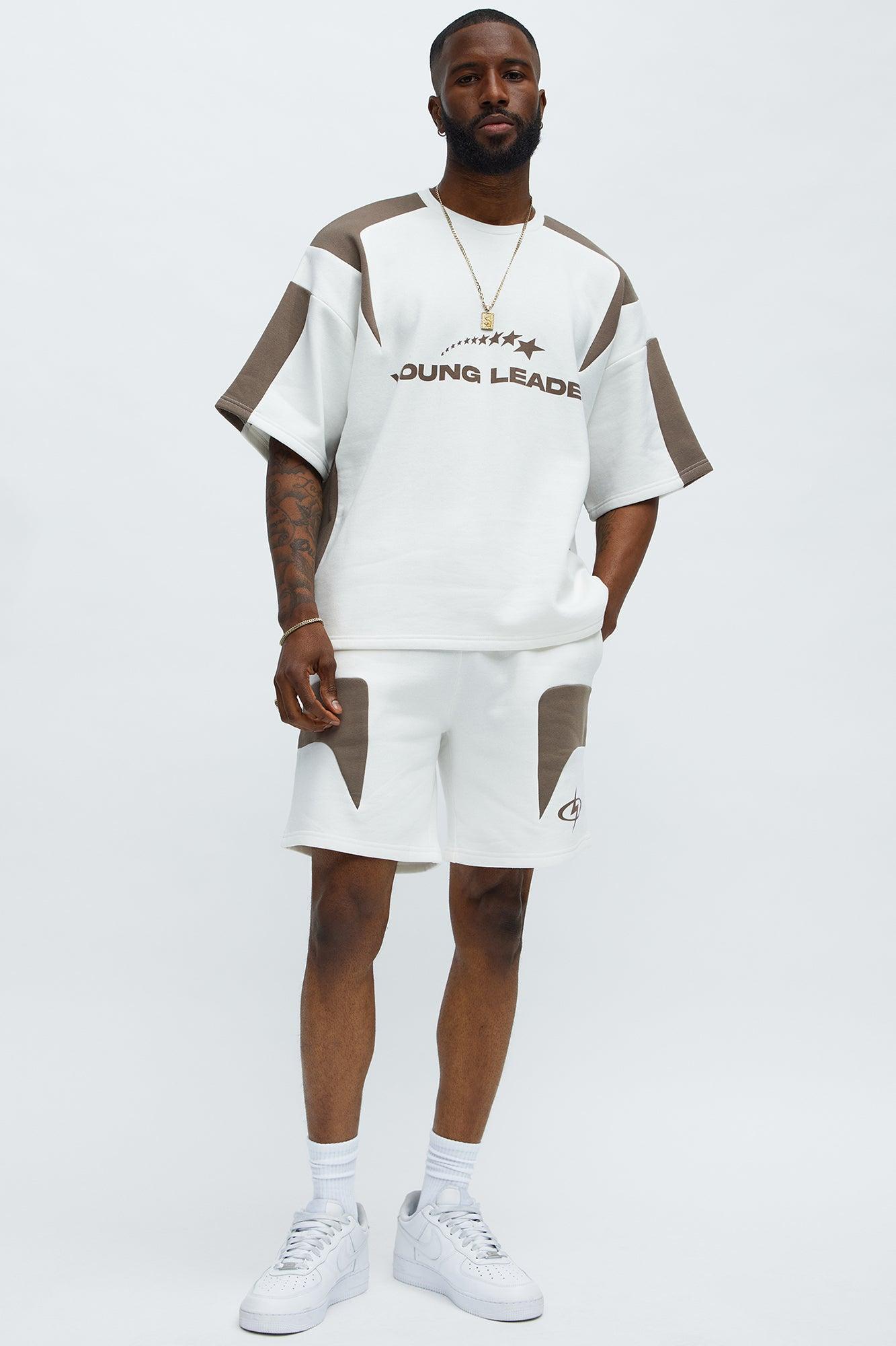 Available In White. Elastic Waistband Drawstring Side Pocket Pair With "Young Leader Oversized Tee" Disclaimer: Due To The Printing Process A Difference In Saturation May Occur. Each Garment Is Unique. 60% Cotton 40% Polyester Imported