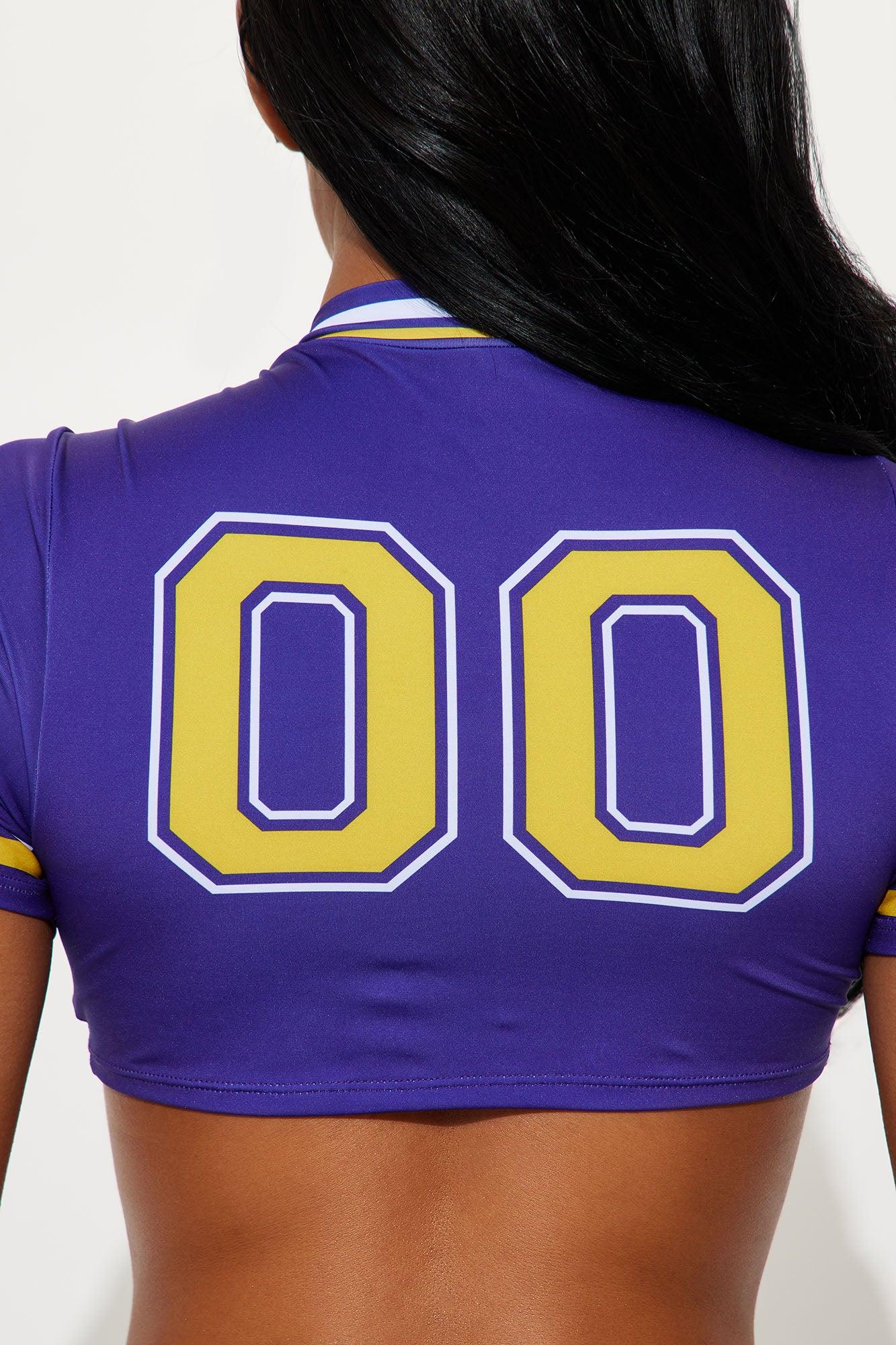 Available In Gold/Purple, White/Blue, Gold/Red, Silver/Black, And Navy/Red. Micro Cropped Jersey Boomerang Thong Contrast Stripe Fitted Short Sleeve Final Sale. Disclaimer: Due To The Printing Process A Difference In Saturation May Occur. Each Garment Is Unique. Self: 78% Polyester/ 22% Elastane Elastic: 87.33% Polyamide 12.67% Elastane Imported