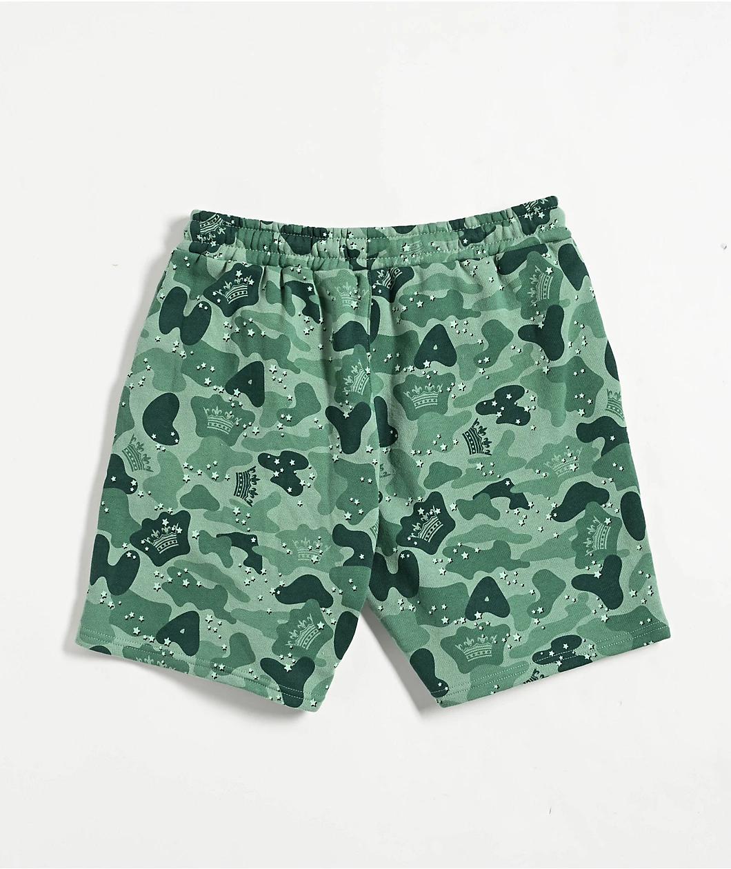 Add a relaxed vibe to any outfit with the sweat shorts from Your Highness, landing in a green "Ocean Camo" pattern with crown branding throughout. Screen-printed white brand script across the front is bejeweled with silver rhinestones for brilliant,