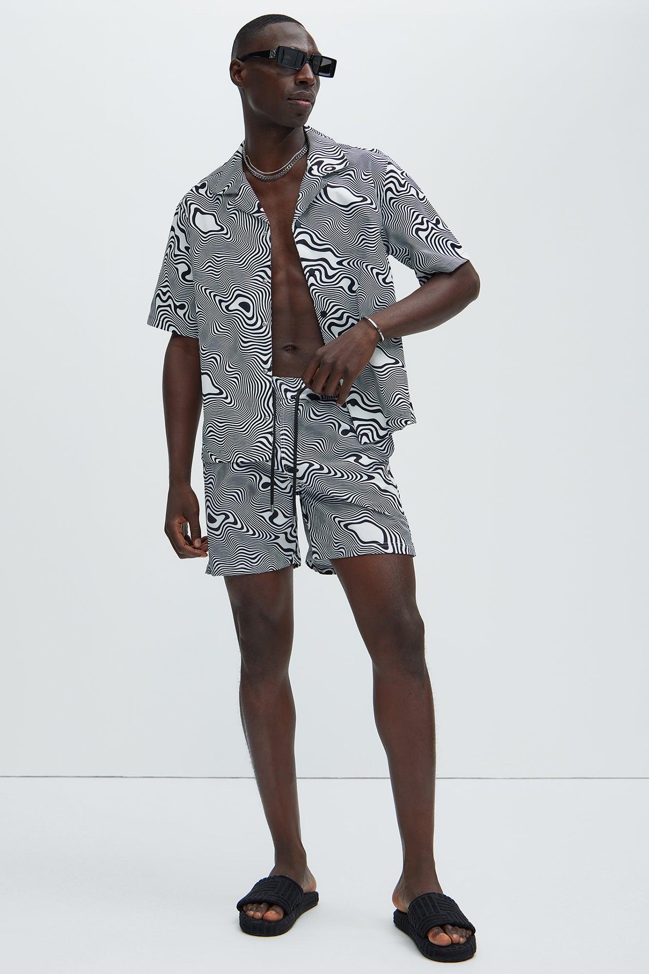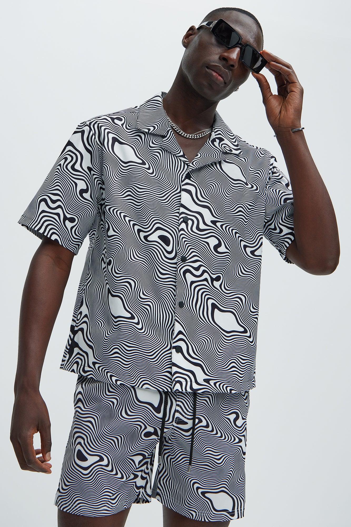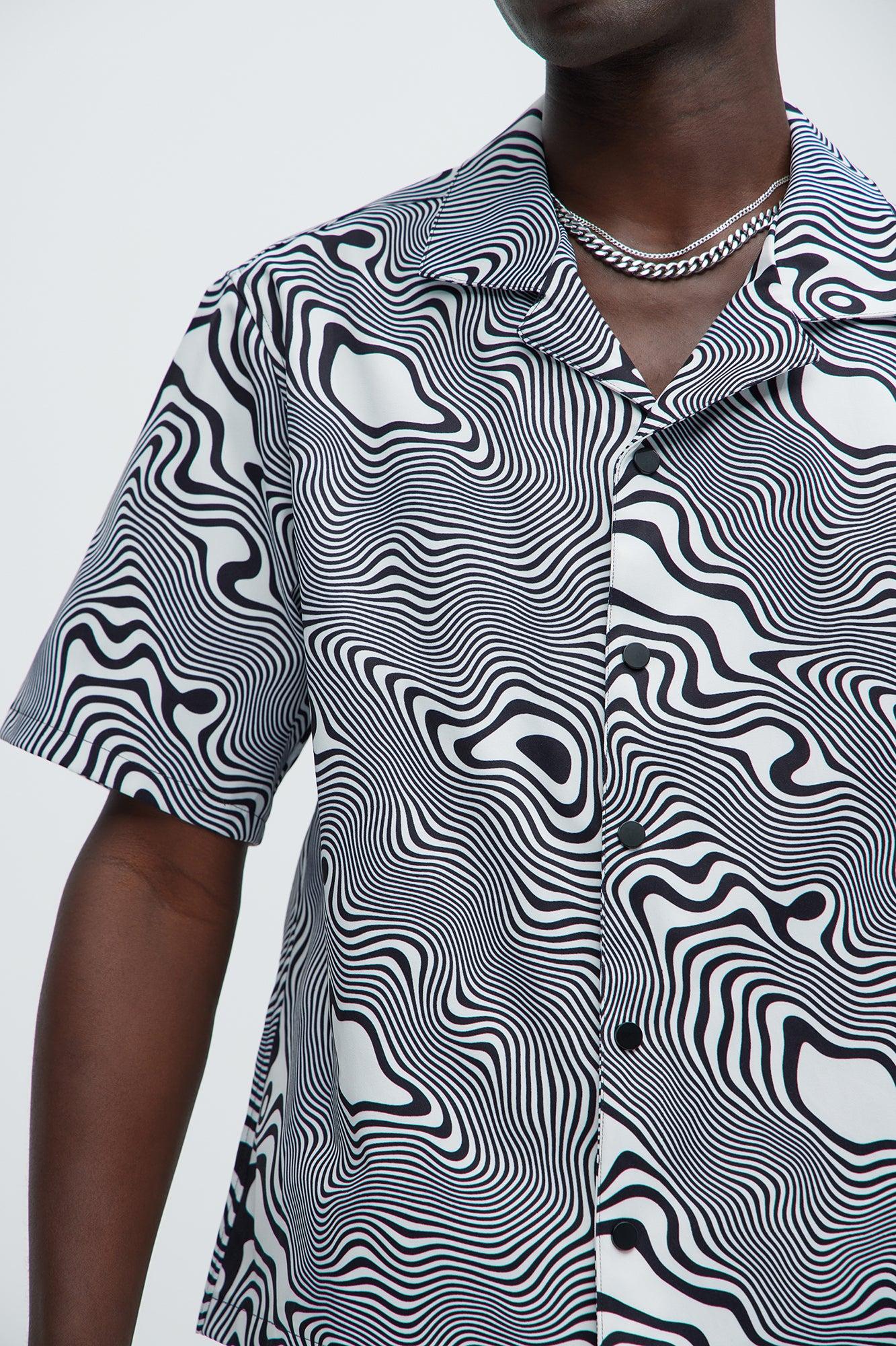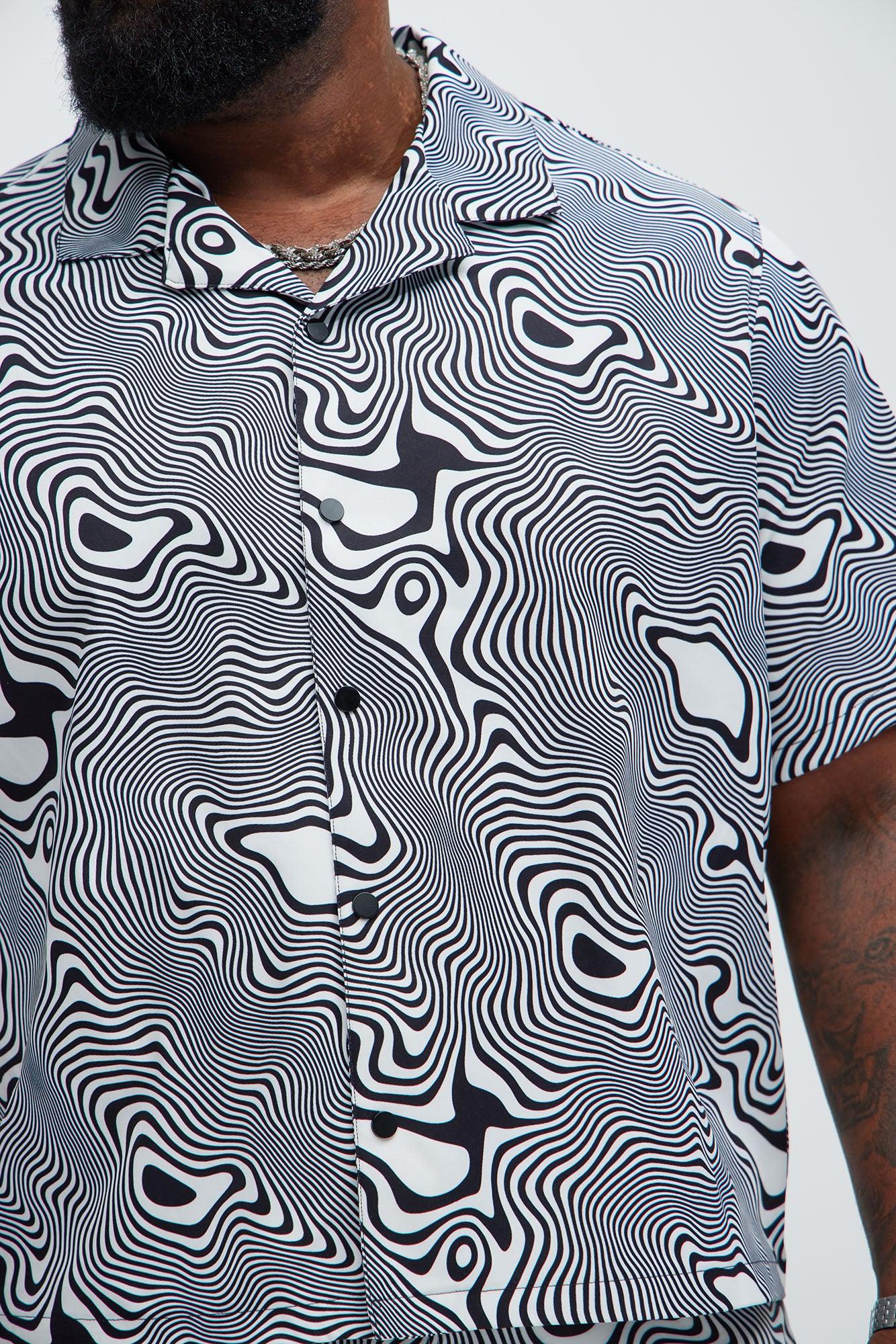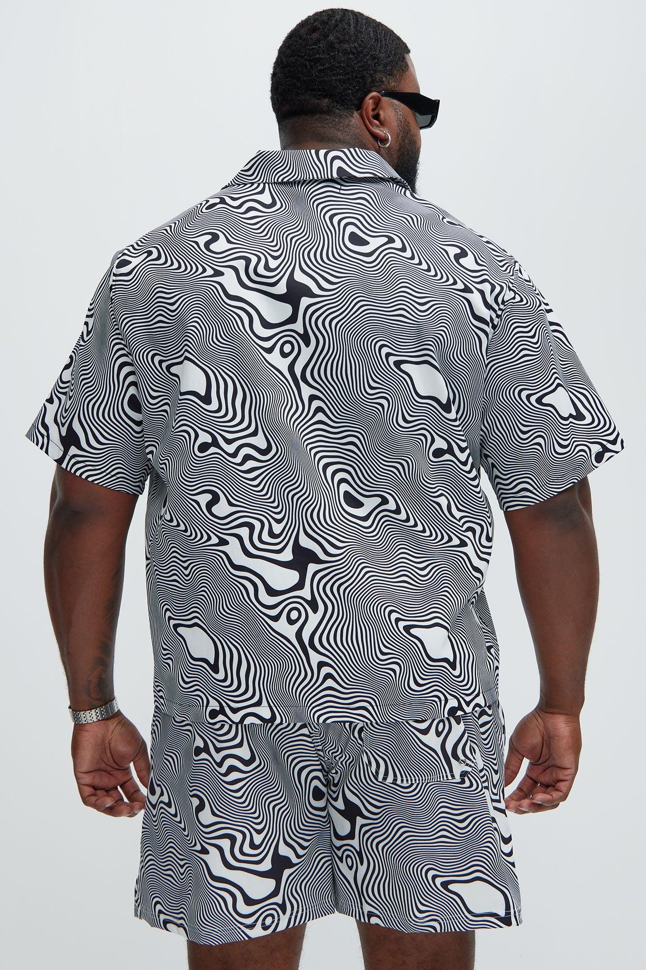 Available In Black/White. Fold Down Collar Front Button Closure Short Sleeve Pair With Your Trippy Swim Trunks Disclaimer: Pattern Placement May Vary. Shell: 100% Polyester Imported California Proposition 65 WARNING: Cancer and Reproductive Harm - www.P65Warnings.ca.gov.