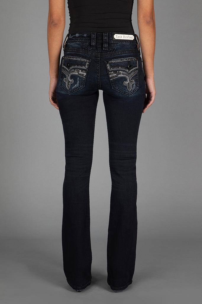Yui Bootcut Jeans by Rock Revival with a bootcut silhouette crafted in a dark wash, designed in Los Angeles. Premium stretch denim for comfort and durability Signature inverted Fleur-de-Lis embroidery Custom pewter hardware and rivets Engraved 'Rock Revival' leather waist patch