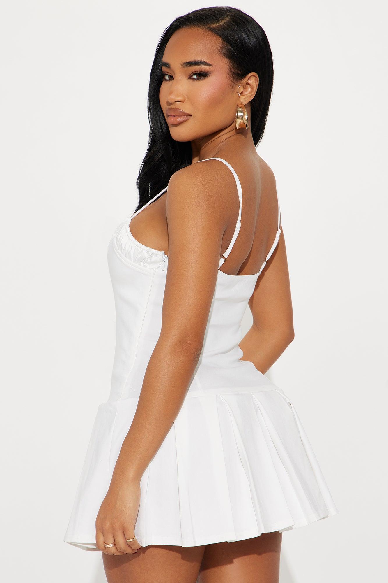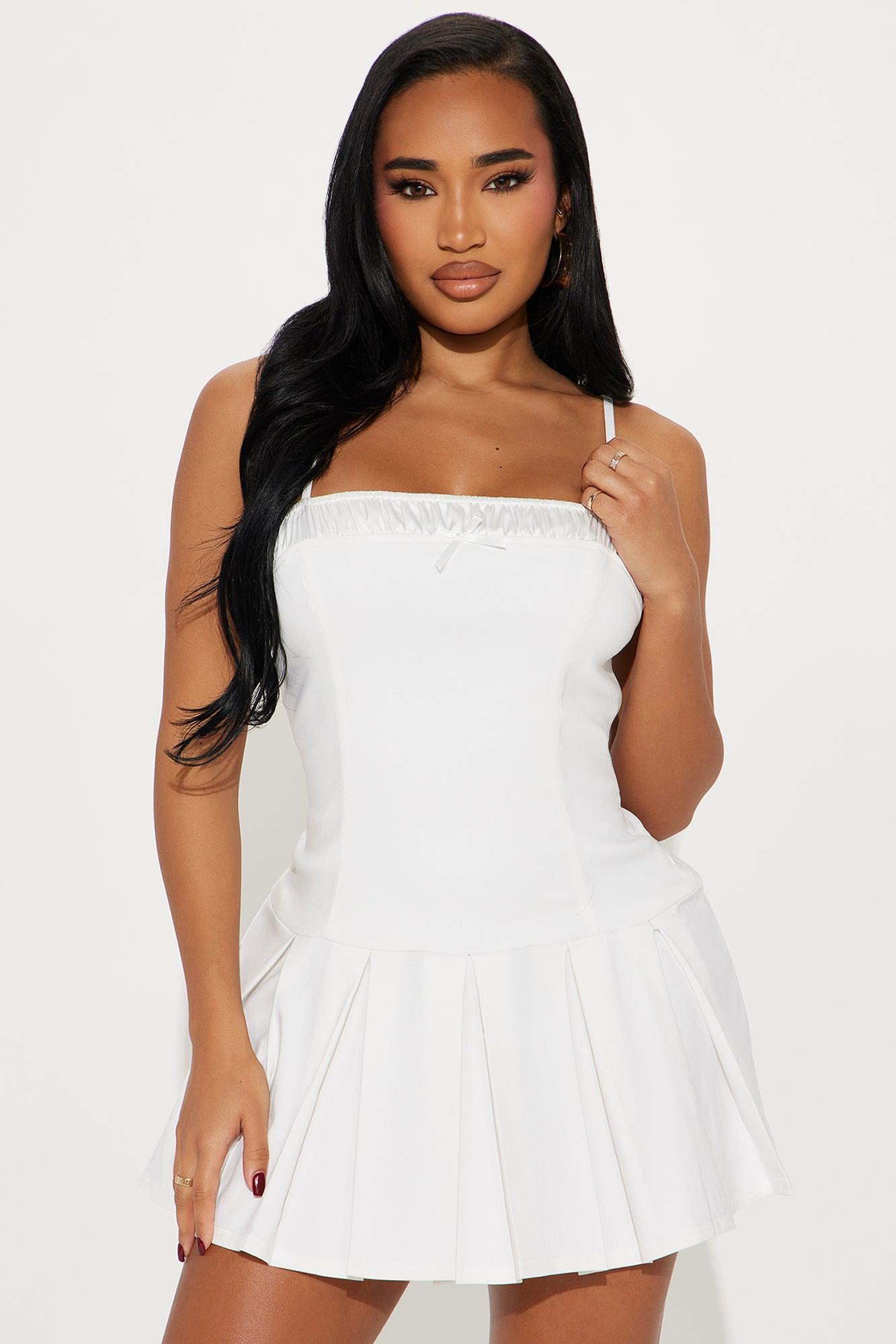 Available In Black, Taupe, And White. Pleated Twill Mini Dress Square neckline Adjustable spaghetti straps Bow detail Satin contrast trim Pleated Stretch Shell 1: 60% Rayon 35% Polyester 5% Spandex Shell 2: 97% Polyester 3% Spandex Imported