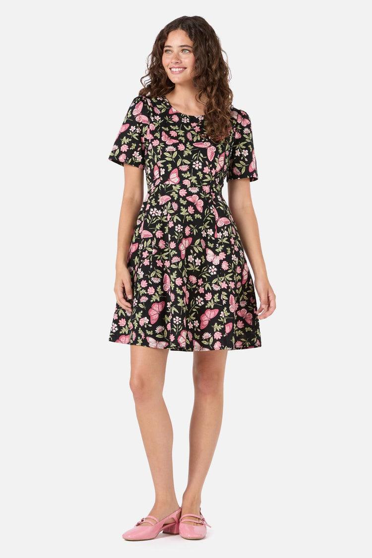 Feminine and full of flutter, the Yvette Butterfly Mini Dress by Princess Highway is your go-to for sweet, vintage-inspired charm. With a black base scattered in soft pink butterflies and florals, it’s a little garden party in dress form.Short sleeves, a high neckline, and a fitted bodice flow into a flirty flared skirt that finishes just above the knee. Wide side ties add a playful touch, while the invisible back zip keeps things sleek and simple. A cotton classic made for sun-drenched strolls and spontaneous twirls.Fabric & Care100% CottonCold delicate machine washWash inside out with like coloursDo not wring, bleach, soak or tumble dryLine dry in shadeCool iron on reverse if requiredDo not dry cleanModel DetailsRuby wears a size 8Height: 175cm | Bust: 81cm | Waist: 61cm | Hips: 88cm