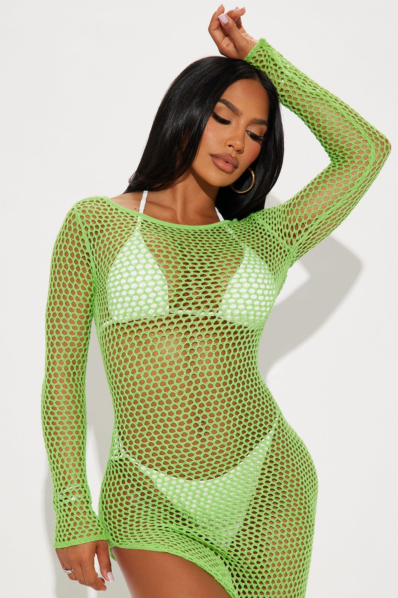 Available In Green. Swim Cover Up Dress Crew Neck Long Sleeve Maxi Length Bodycon Sheer Knit Crochet Full Stretch Final Sale 100% Cotton Imported