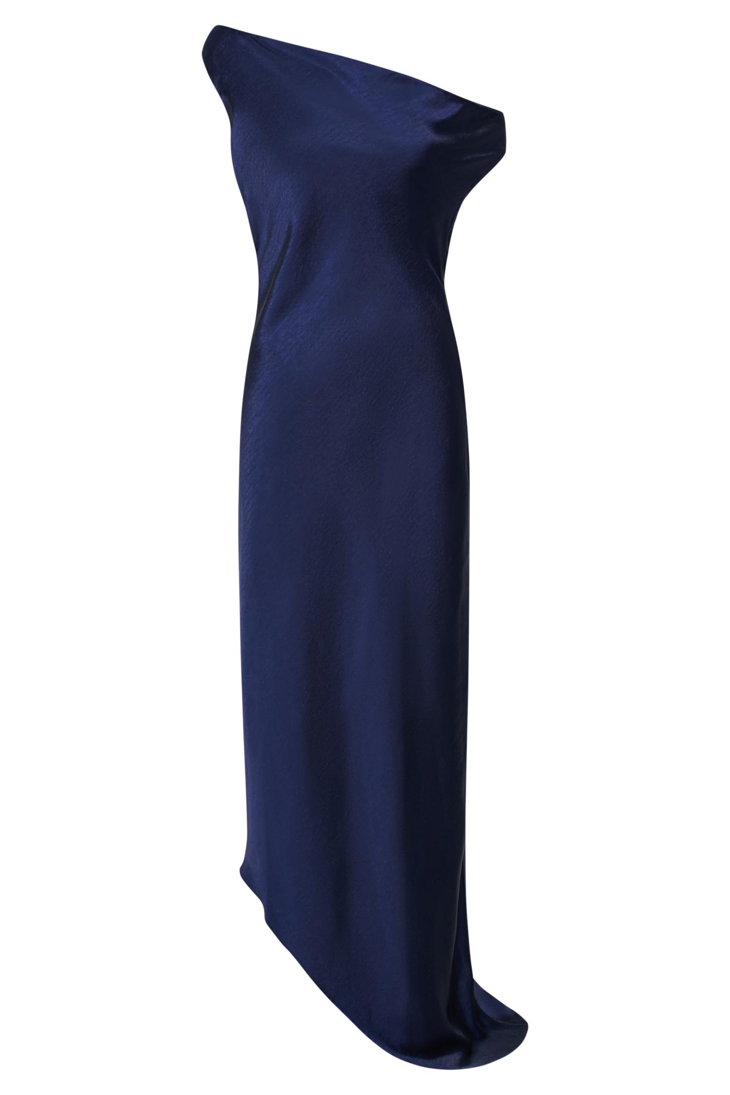 This style is designed to be a relaxed fit, please size down for a more fitted look. Art is asymmetrical. YVETTE is a Slip Maxi Dress with a low, open back, a slight cowl detail for the front neckline, and a loose, flowing hem. The front neckline dips into a slanted arrangement, with one shoulder strap up for a sleeveless look and the other down in an off-shoulder style. The asymmetrical hem is much the same, with one part gathered above the ankle and the other hitting the ground. Two thin fabric straps run across the back, adding extra detail to the low, back neckline.
