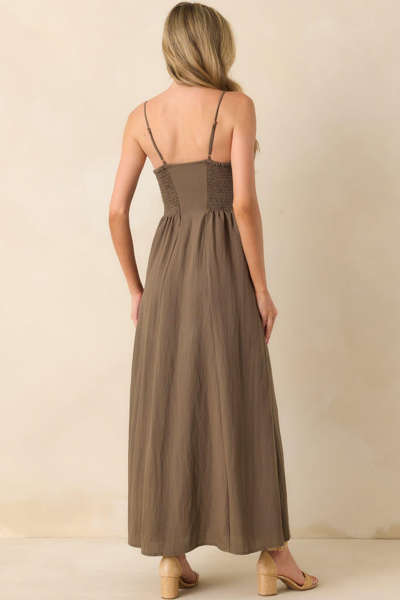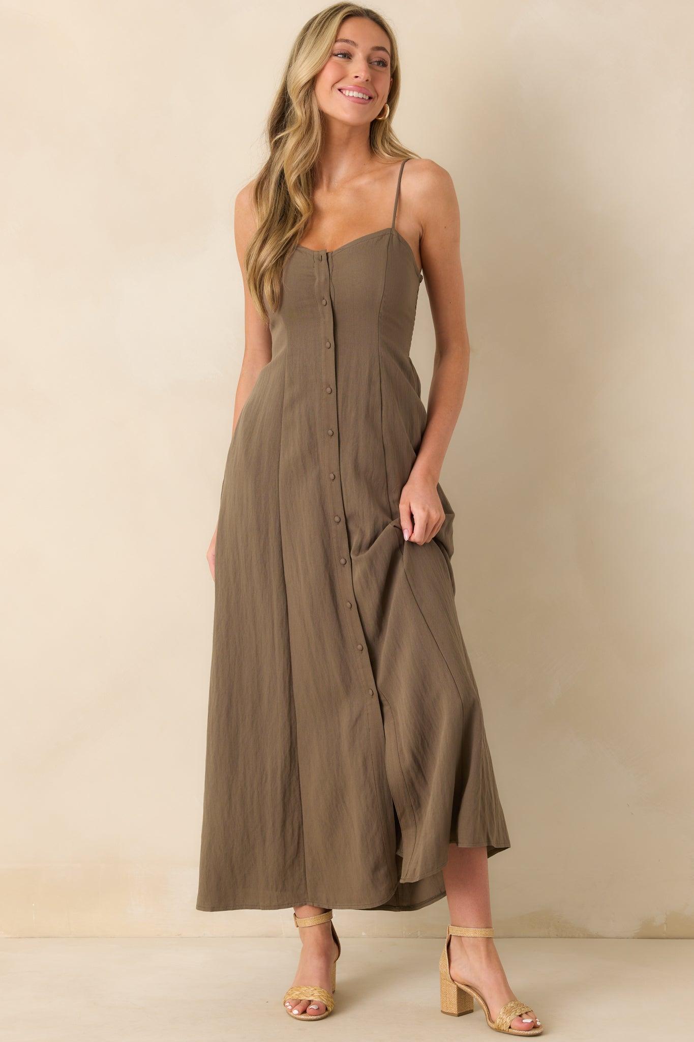 The Z Supply Brown Angel Eyes Airy Midi Dress is that effortlessly cool piece you’ll want on repeat. Light, flowy, and full of understated charm. It’s perfect for those in-between days when you want to feel put-together with zero effort. This tiki brown midi dress features a functional button front, sweetheart neckline, adjustable spaghetti straps, back side smocked panels, full lining, and functional pockets.
