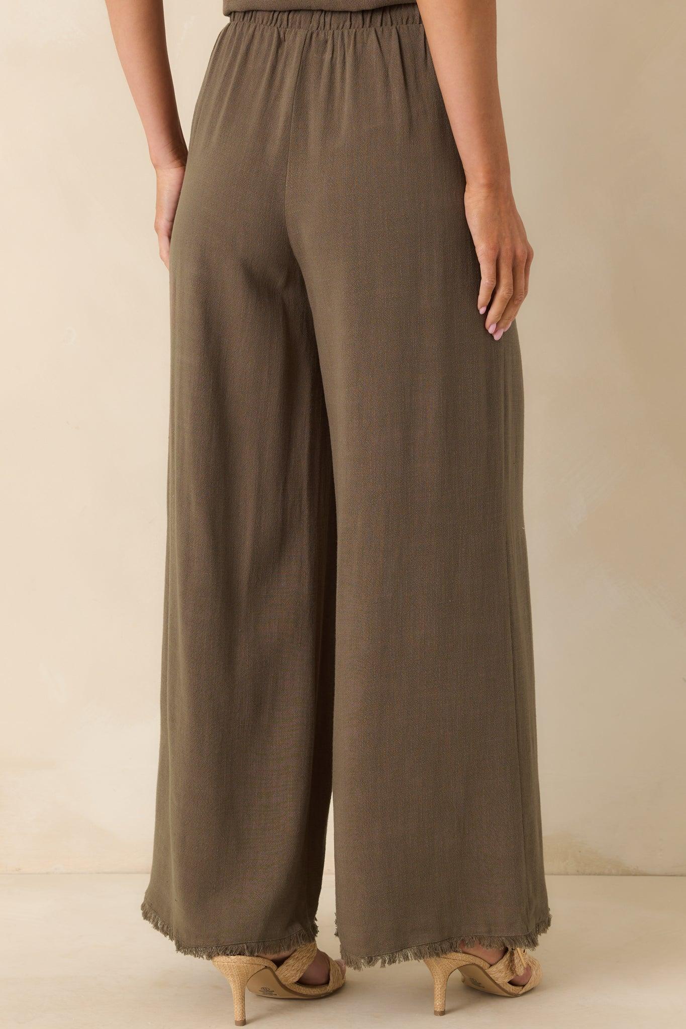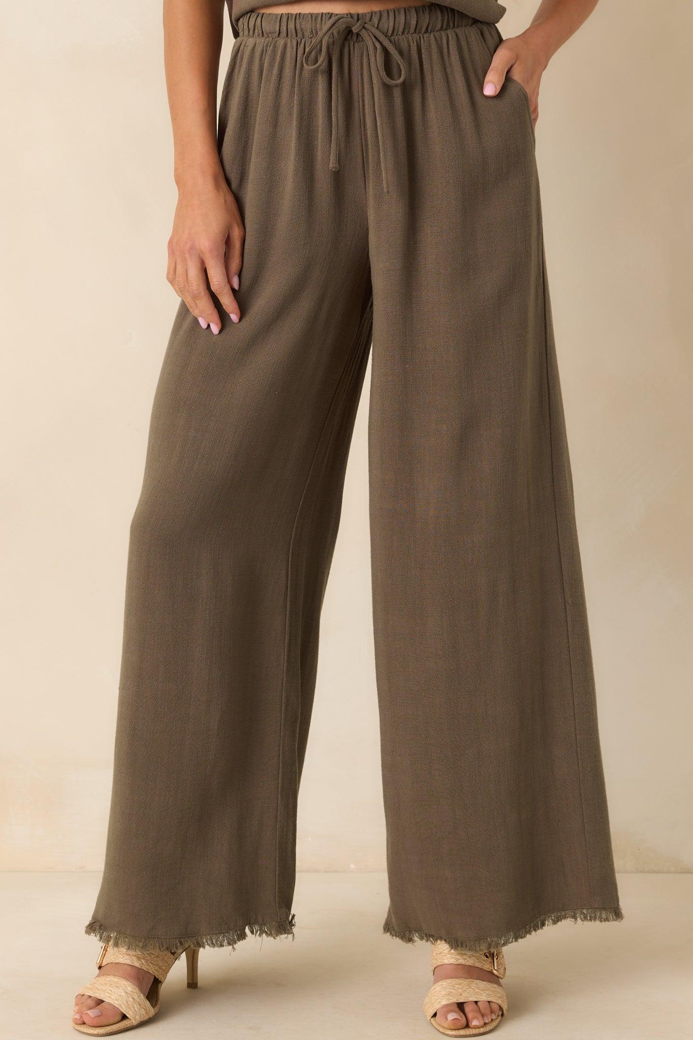 The Z Supply Brown Soren Linen Pants are made for slow mornings and easy afternoons. With their laid-back fit and breathable feel, they bring effortless comfort to days when you just want to keep things simple and stylish. These tiki brown pants feature a lightweight linen blend fabric, elastic waistband, functional drawstring self-tie, frayed bottom hem, high rise, wide leg, and functional pockets.