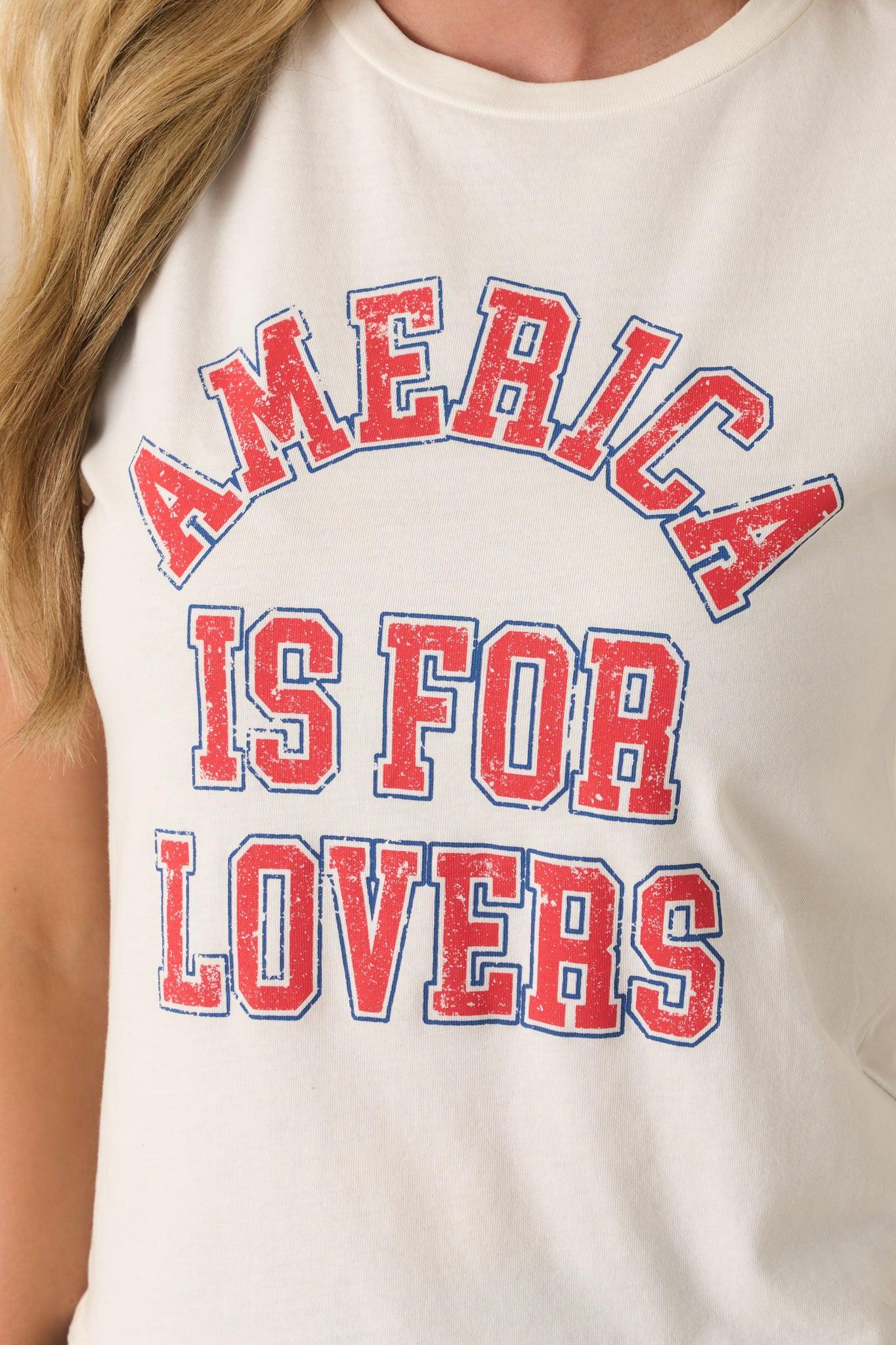 The Z Supply Ivory Cotton Lovers Tourist Tee is for days when you’re feeling laid-back but still want a hint of personality. Casual and easy, it’s perfect for bringing a playful touch to your everyday style. This ivory top features red and blue "America Is For Lovers" collegiate screen print graphic, a crew neckline, relaxed fit, short sleeves, and lightweight 100% cotton jersey fabric. 100% Cotton Unlined Machine Wash Cold Manufactured in China Designed in the USA Model is 5'8" and wearing size x-small