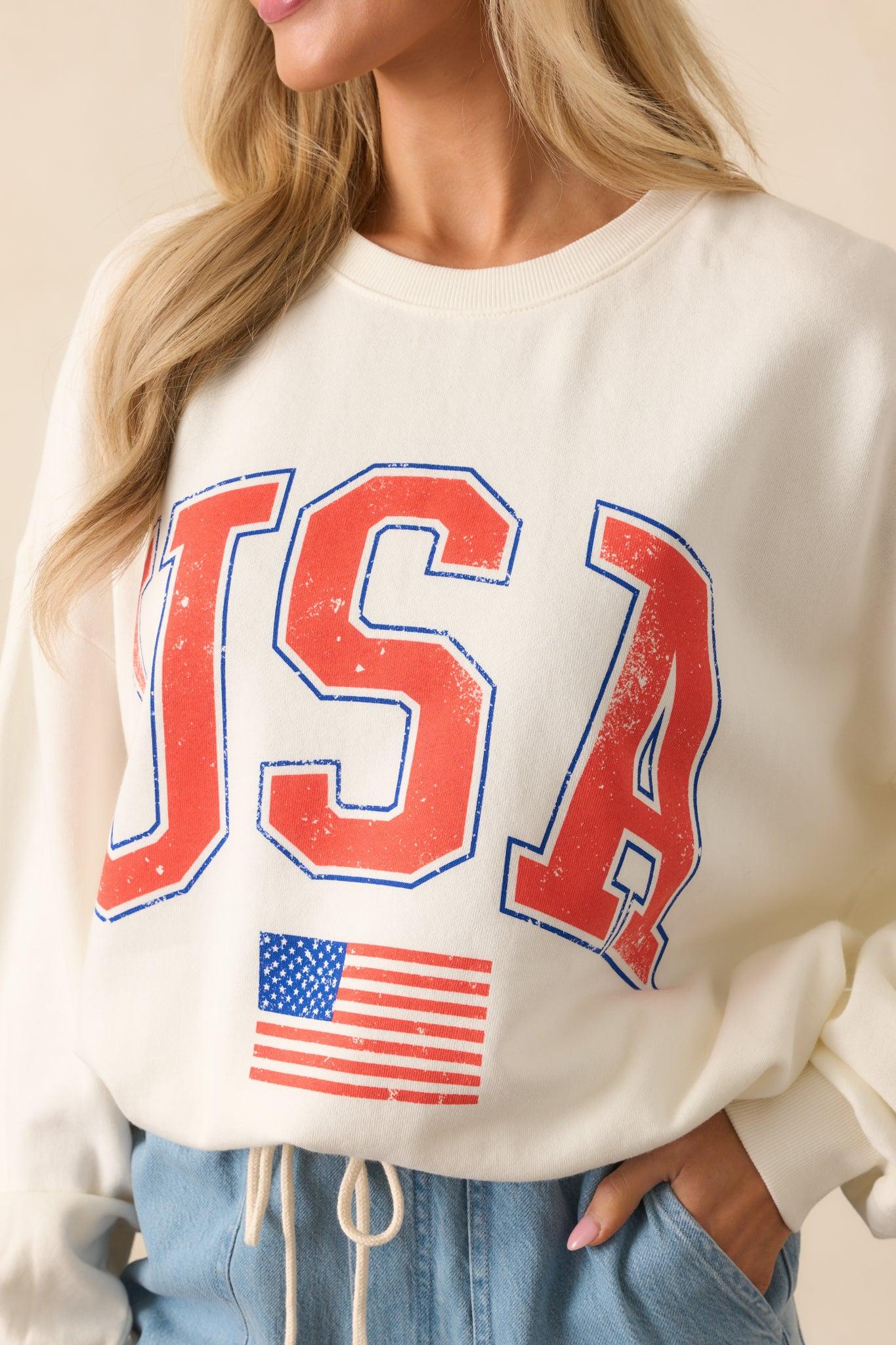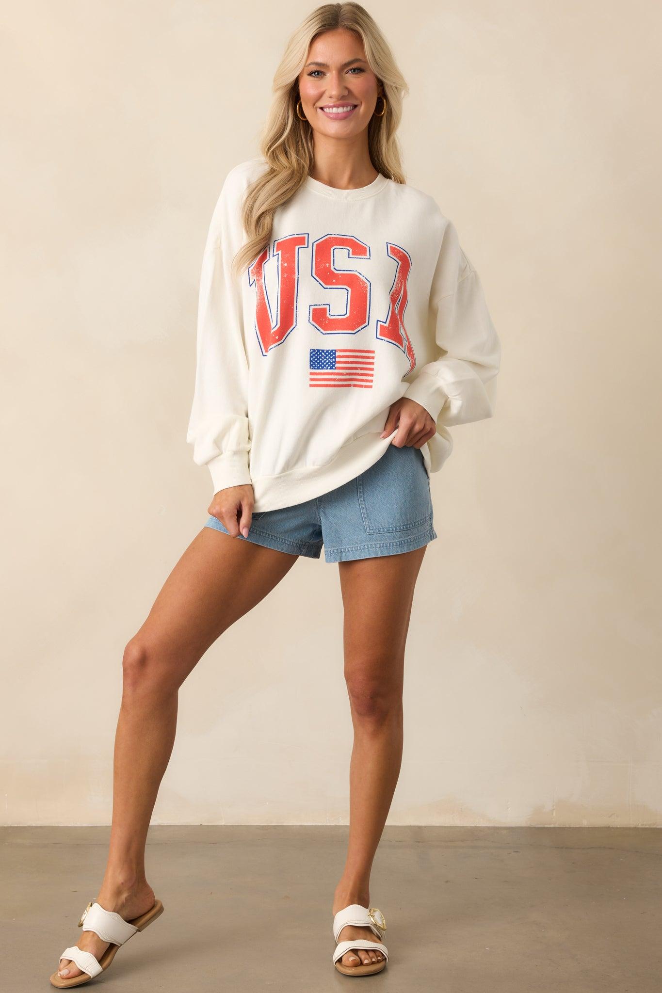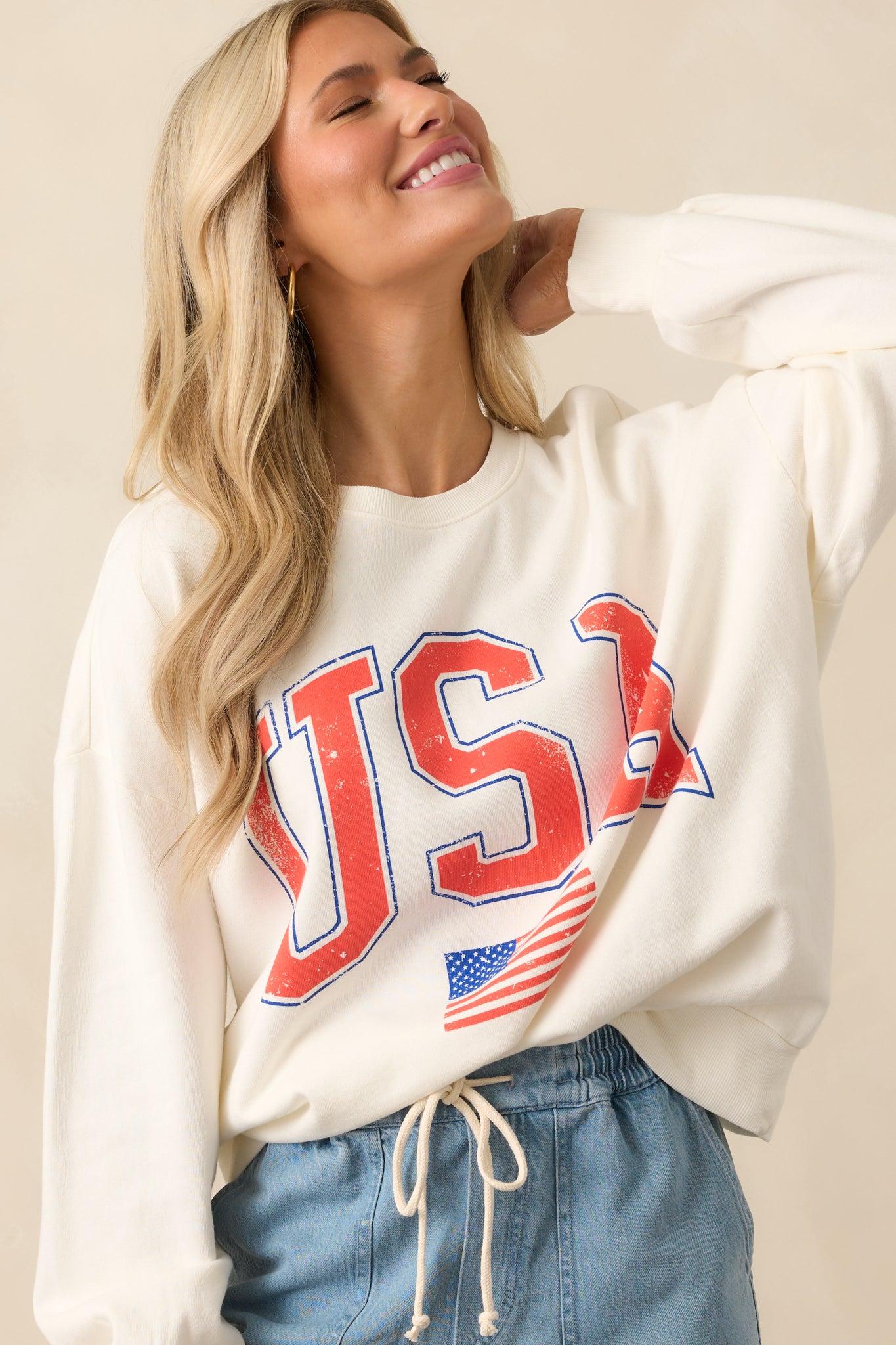 Z Supply Ivory Cotton USA Flag Sunday Sweatshirt is perfect for laid-back days with a hint of patriotic spirit. Soft, casual, and timeless—it’s the one you’ll keep reaching for, no matter what’s on the agenda. This ivory sweatshirt features a "USA" american flat screen print graphic on the front, a crew neckline, long sleeves, ribbed hems, and an oversized fit.